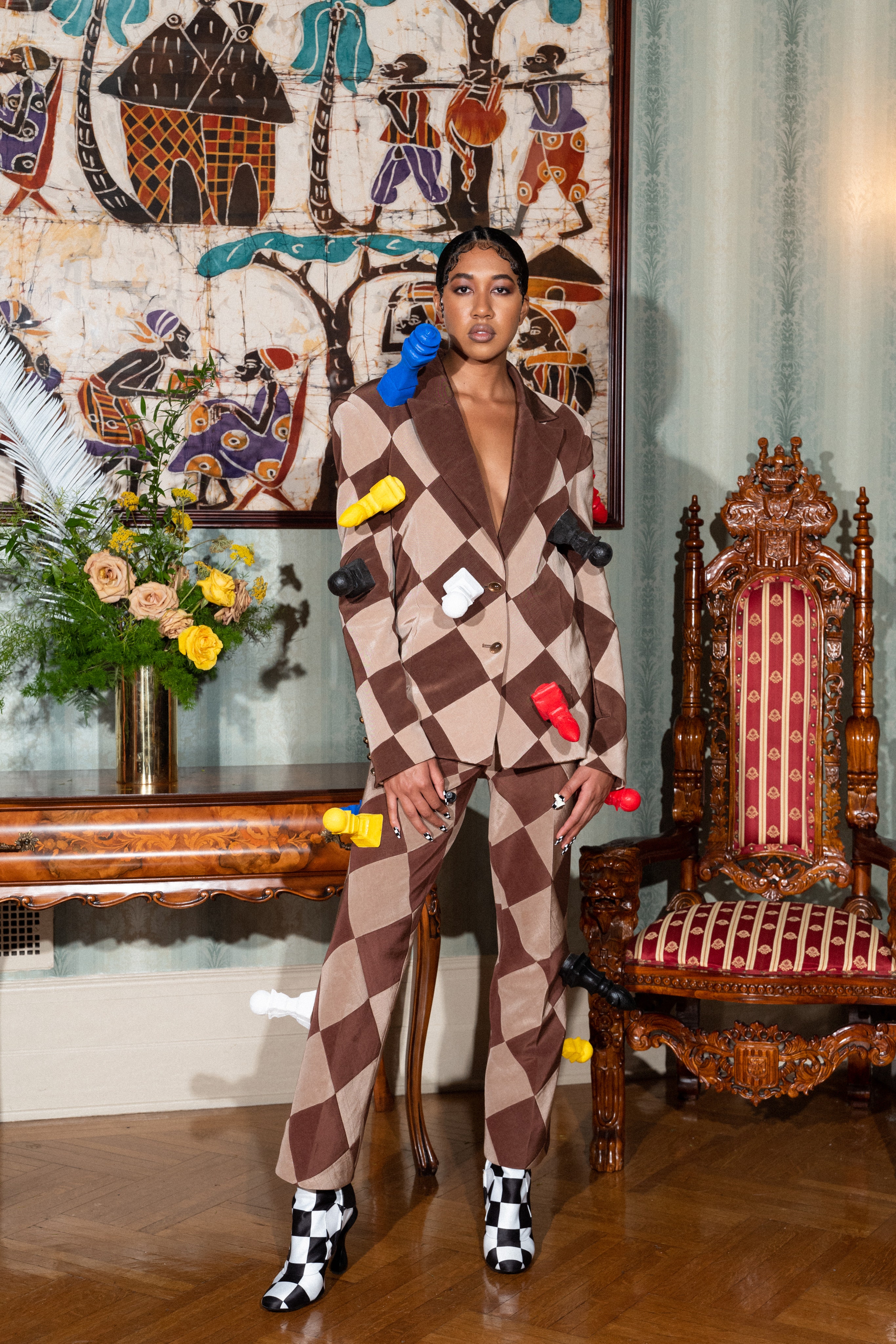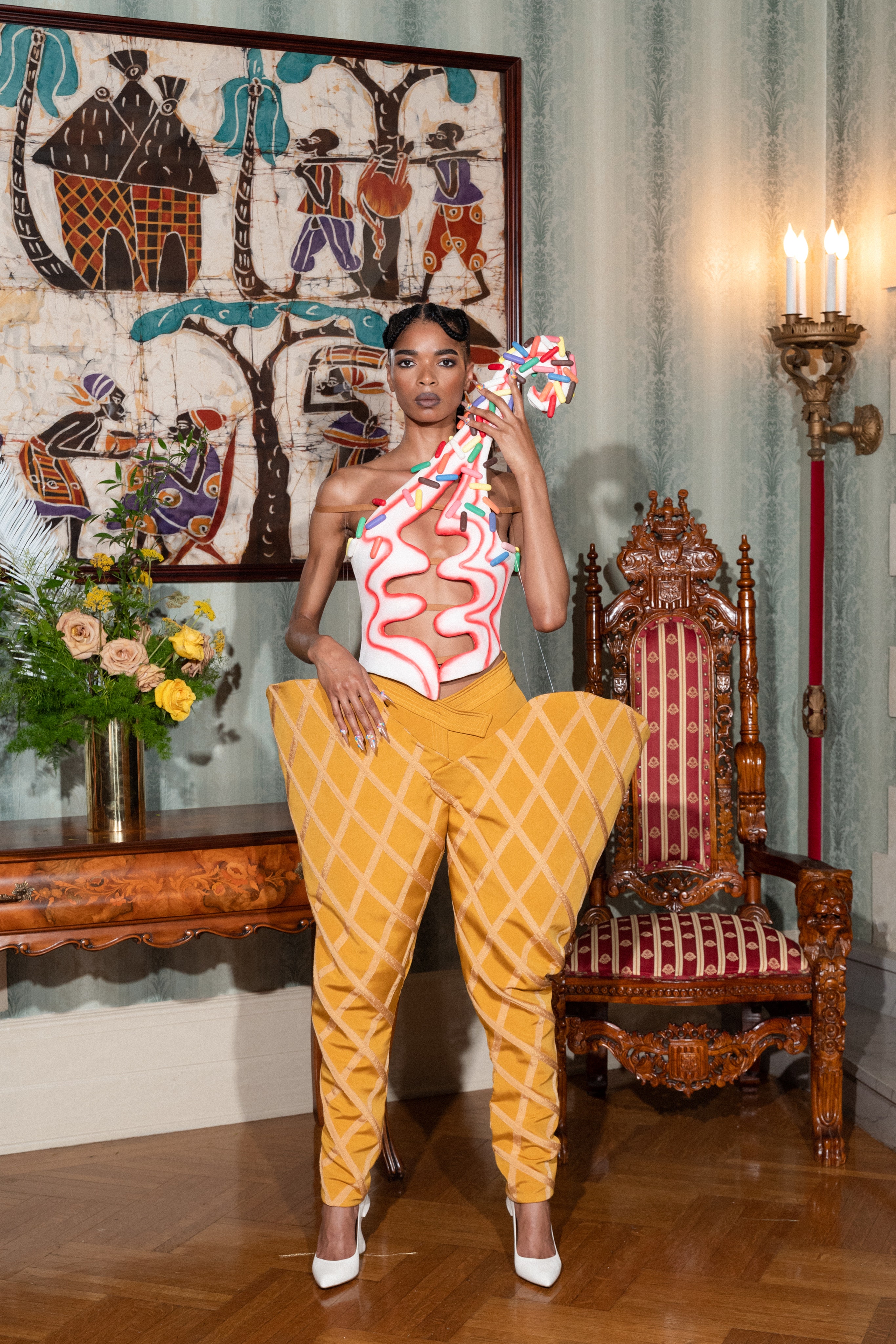 備受矚目的黑人設計師品牌 Pyer Moss 2021 高訂系列 花生醬連衣裙、一部早期型號的手機、巨大的冰淇淋甜筒、髮捲披風。 一場卡通式的視覺盛宴就此展開。 #傳遞知識的副料大學