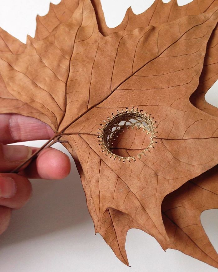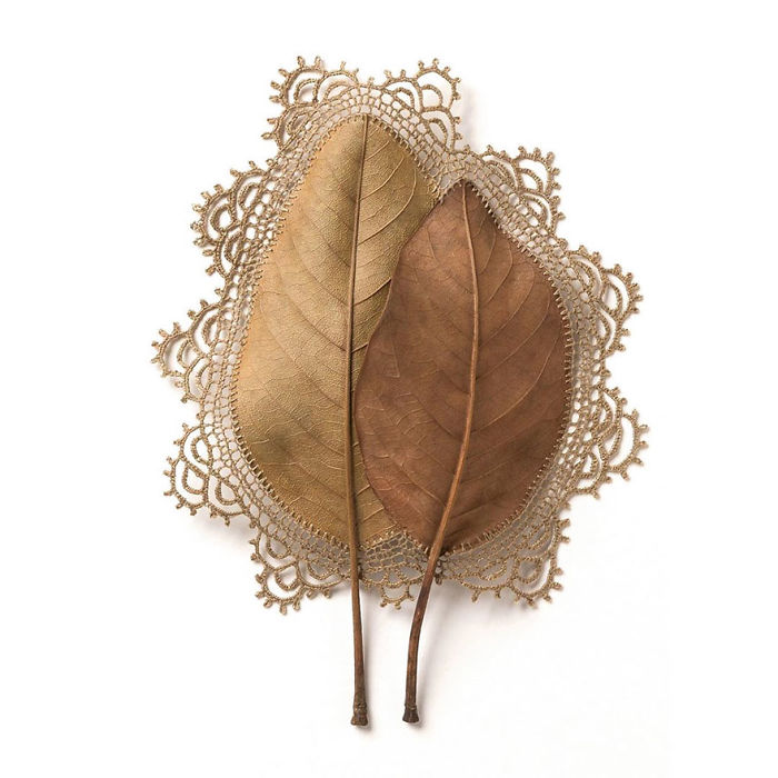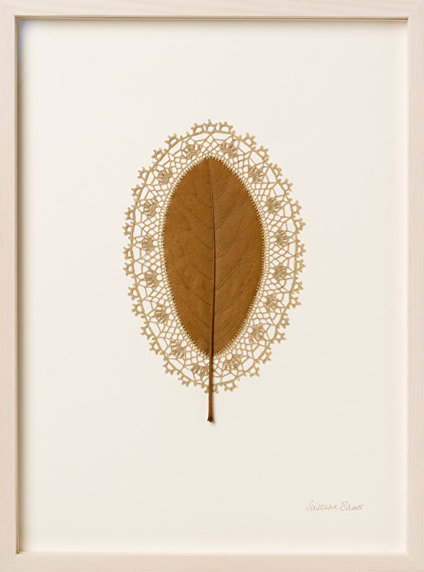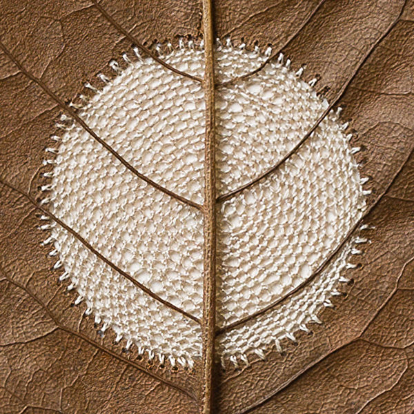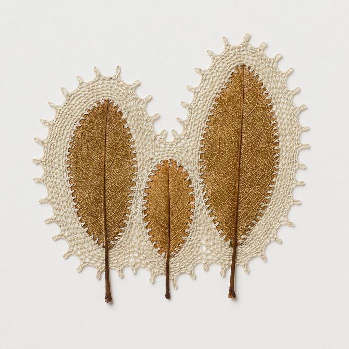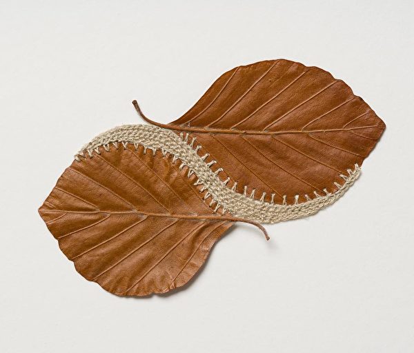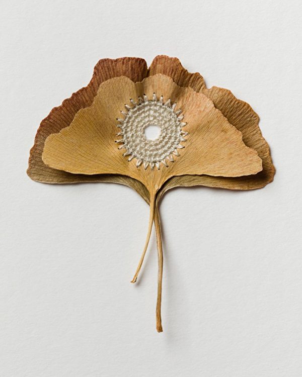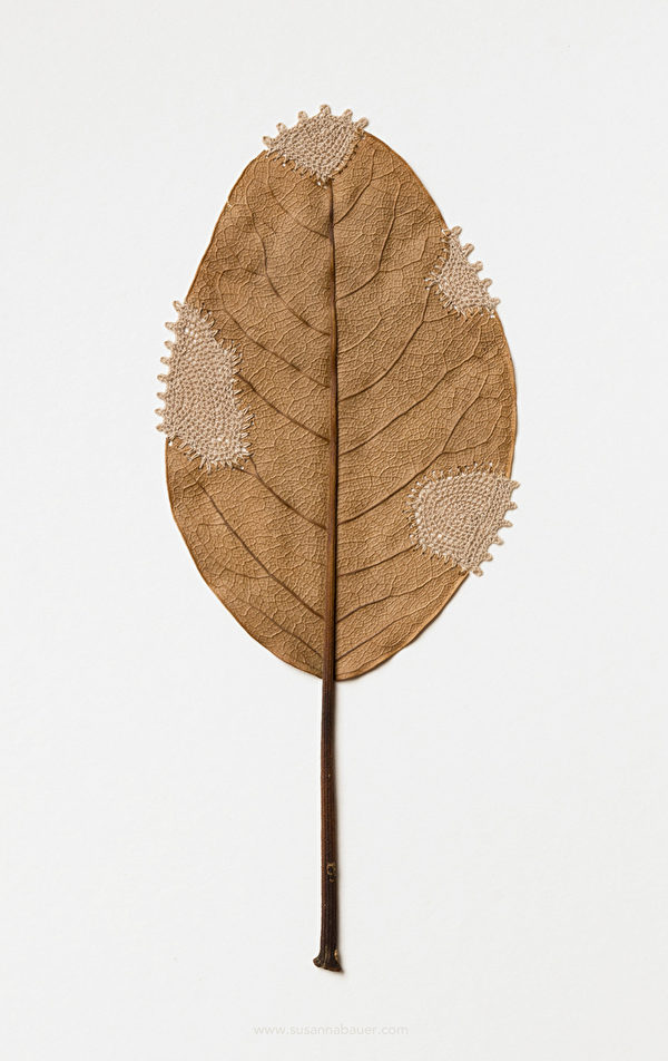Susanna Bauer用靈巧的雙手將枯枝落葉和手工編織做結合,運用鉤針在葉面上揮灑創意。將不起眼的落葉轉為優雅的藝術品。