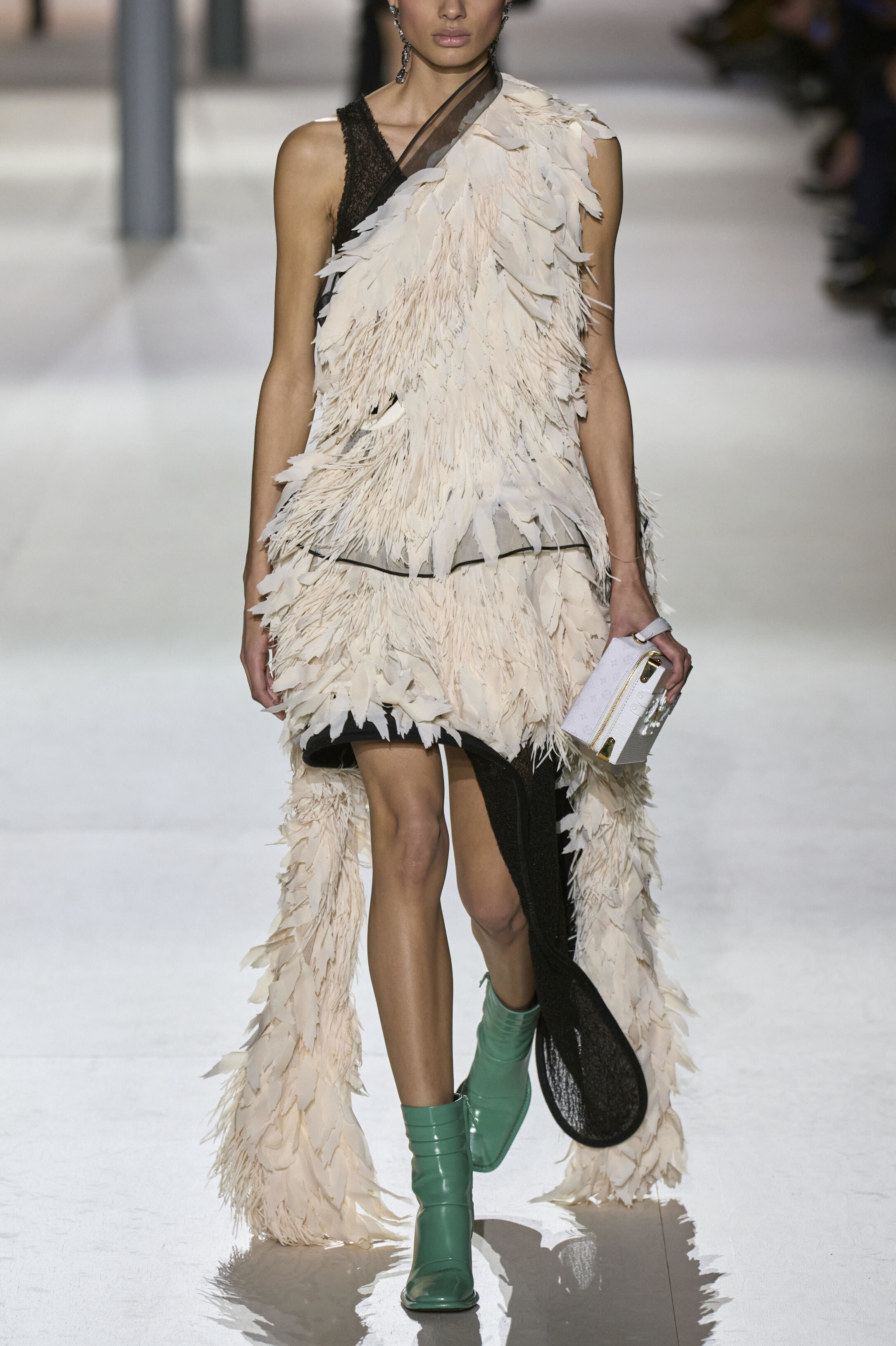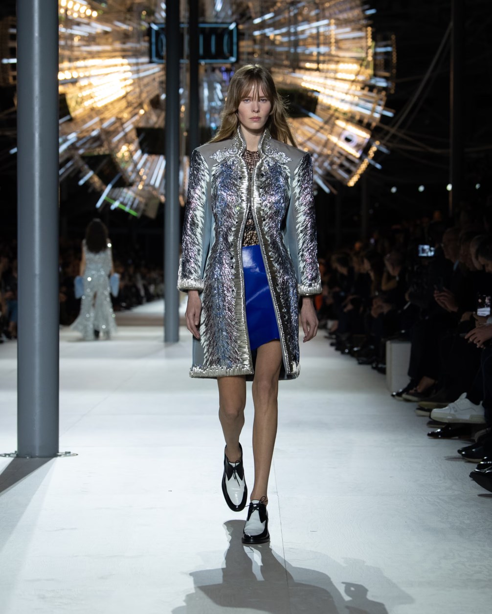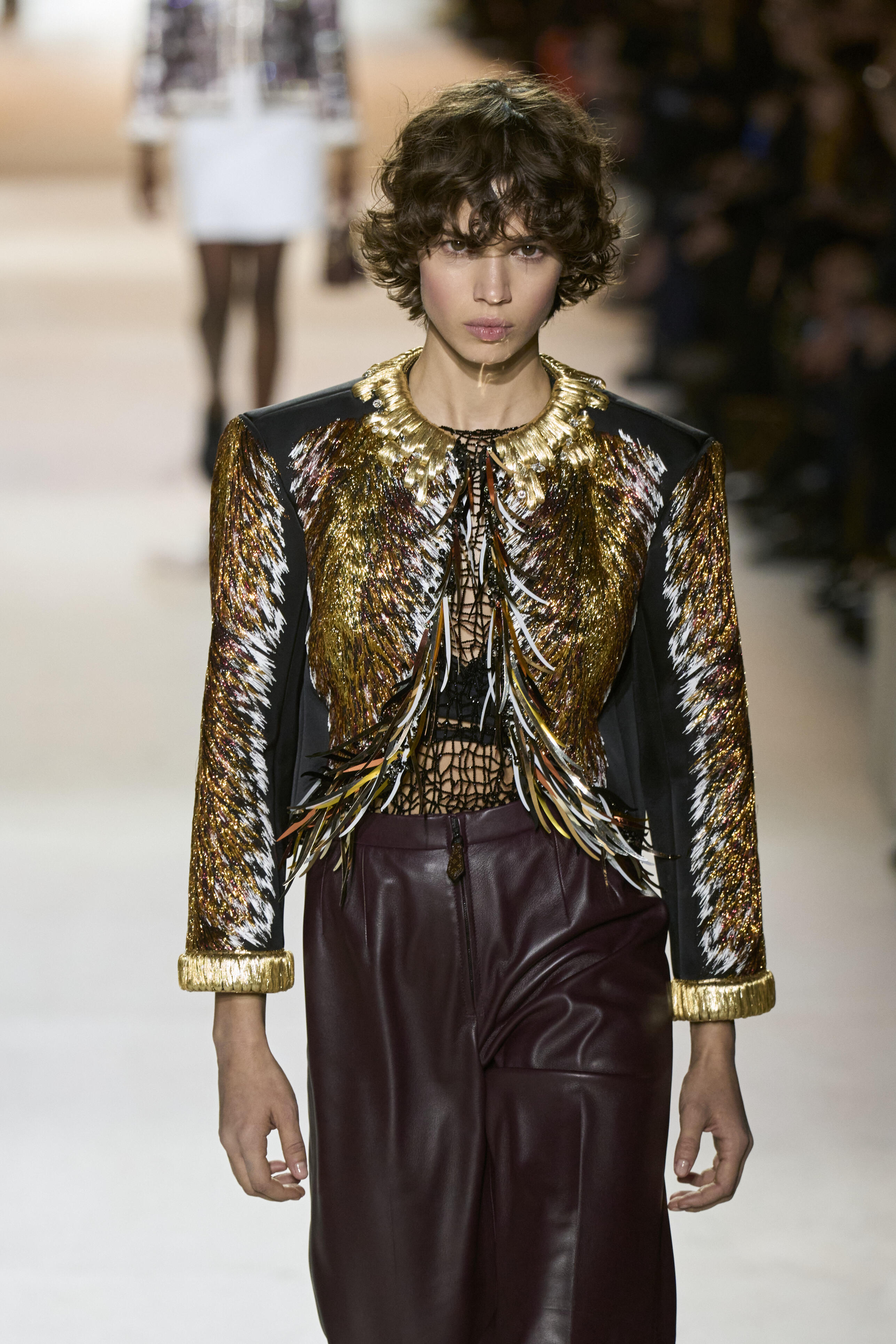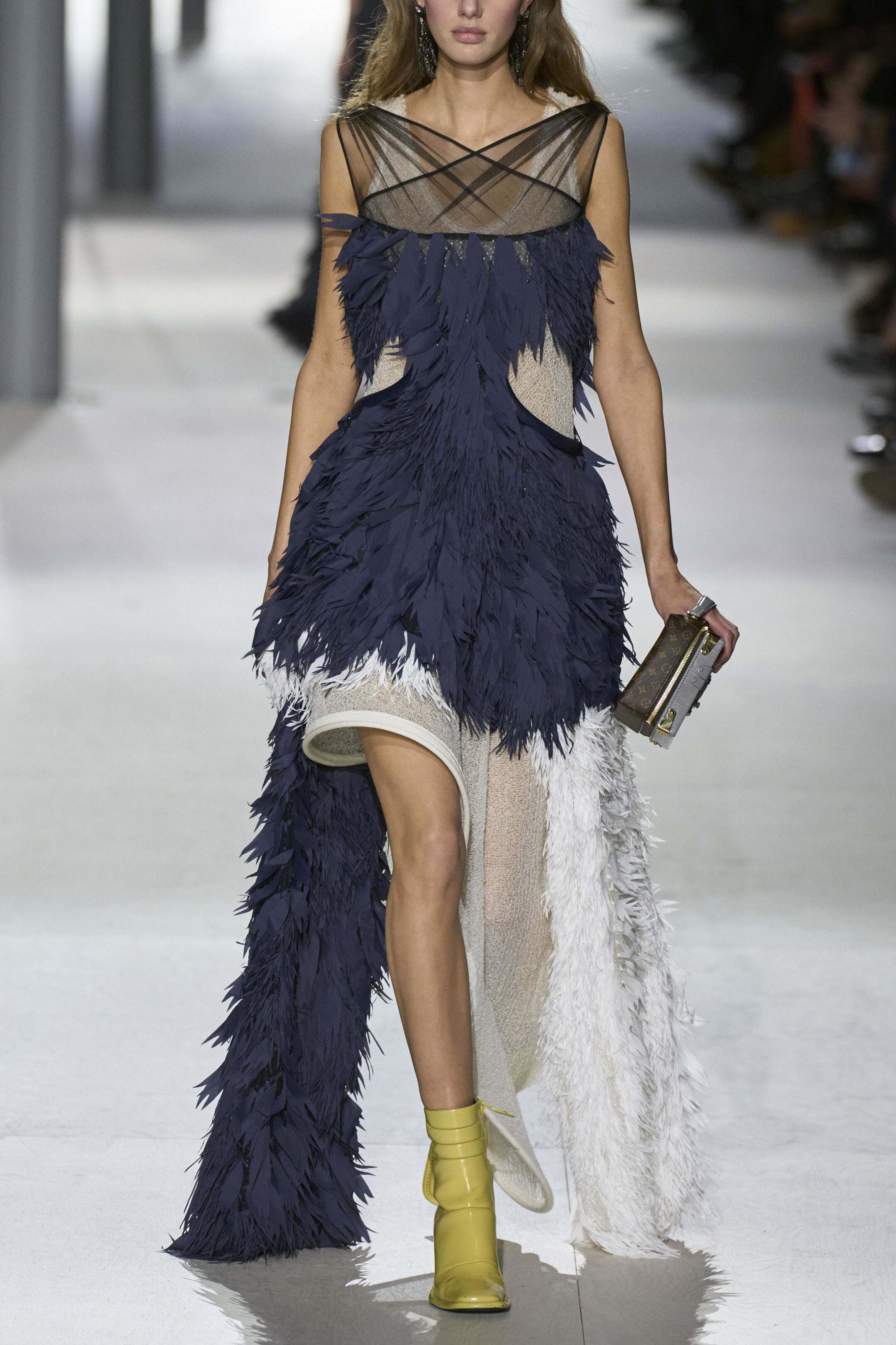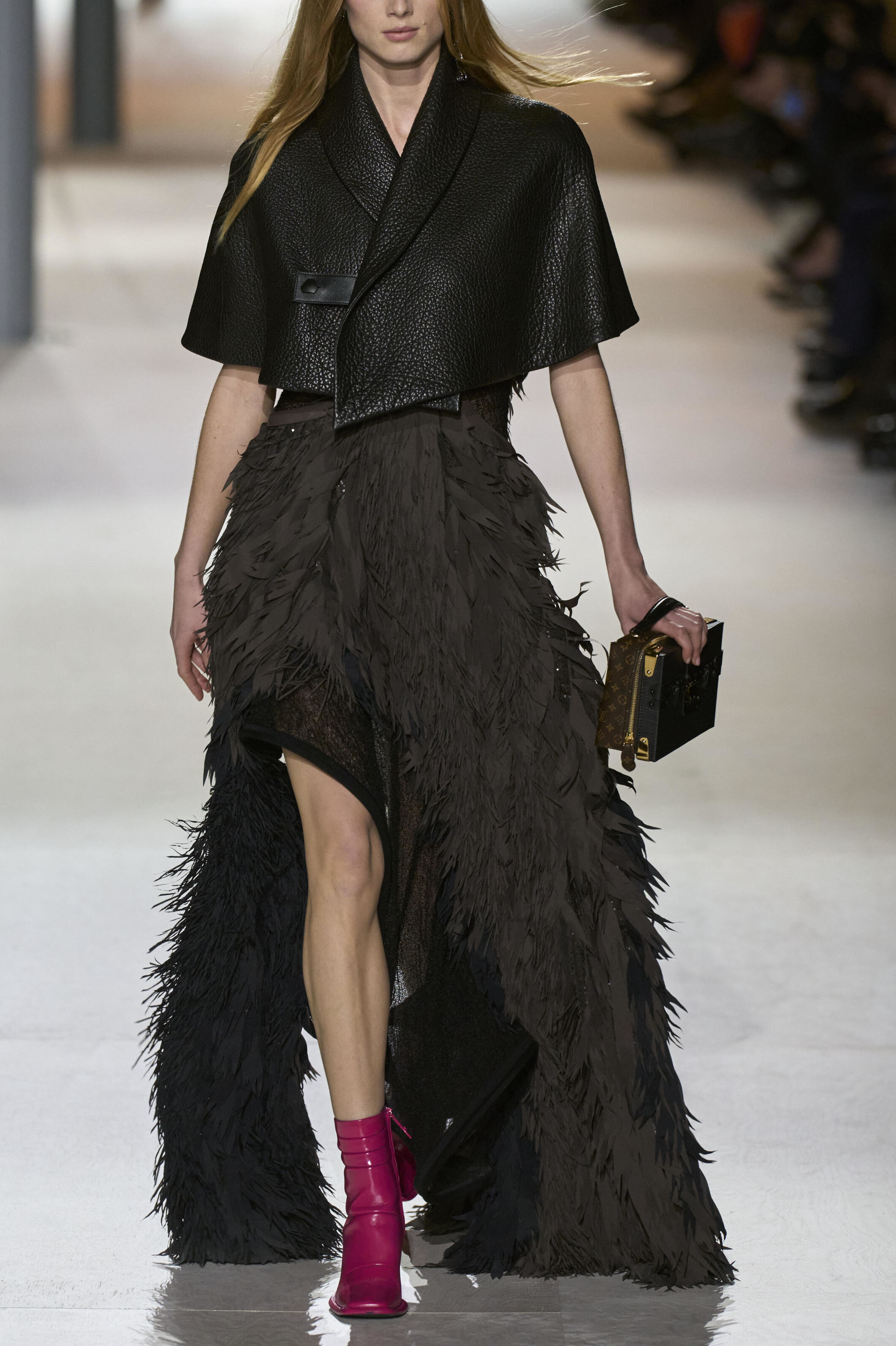 Louis Vuitton 2024 秋冬系列呈現出濃厚的未來主義感,以品牌標誌為靈感,運用圖形圖案、飾有大量金屬線的光澤刺繡、浮誇的羽毛裝飾和精緻前衛的配件,結合出一場致敬過去、展望未來的精彩演出。