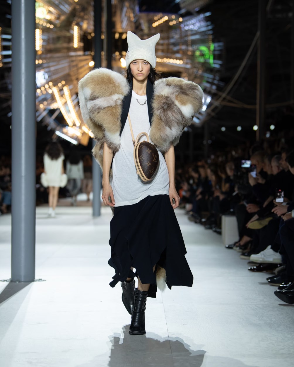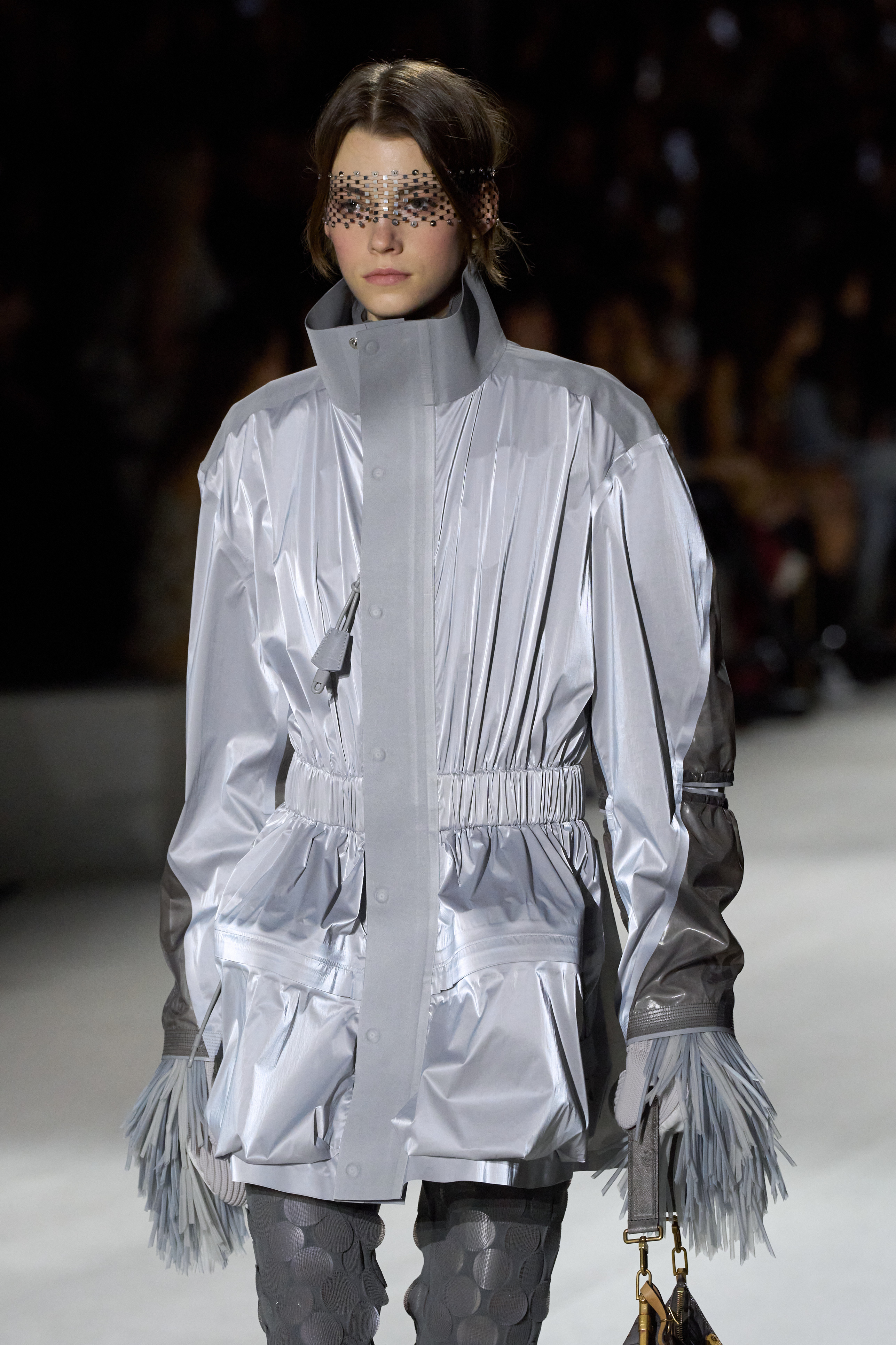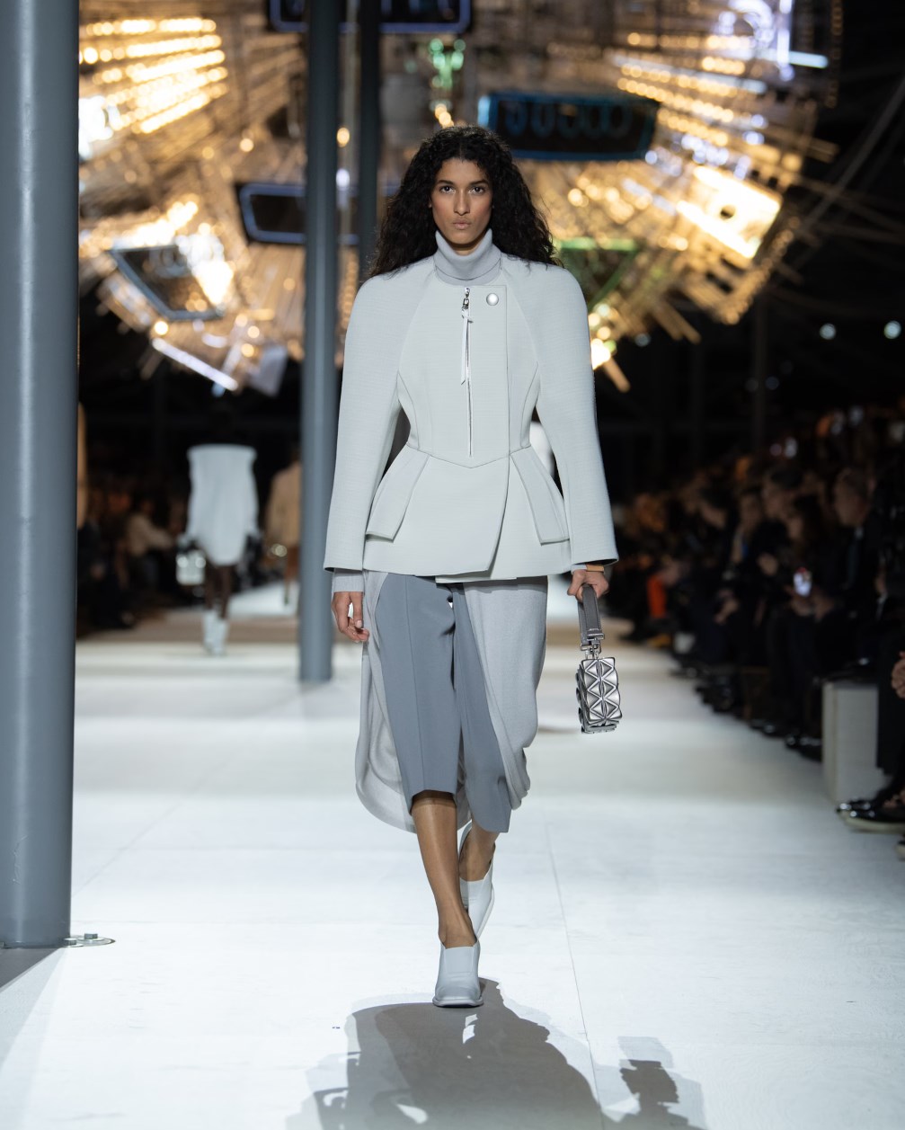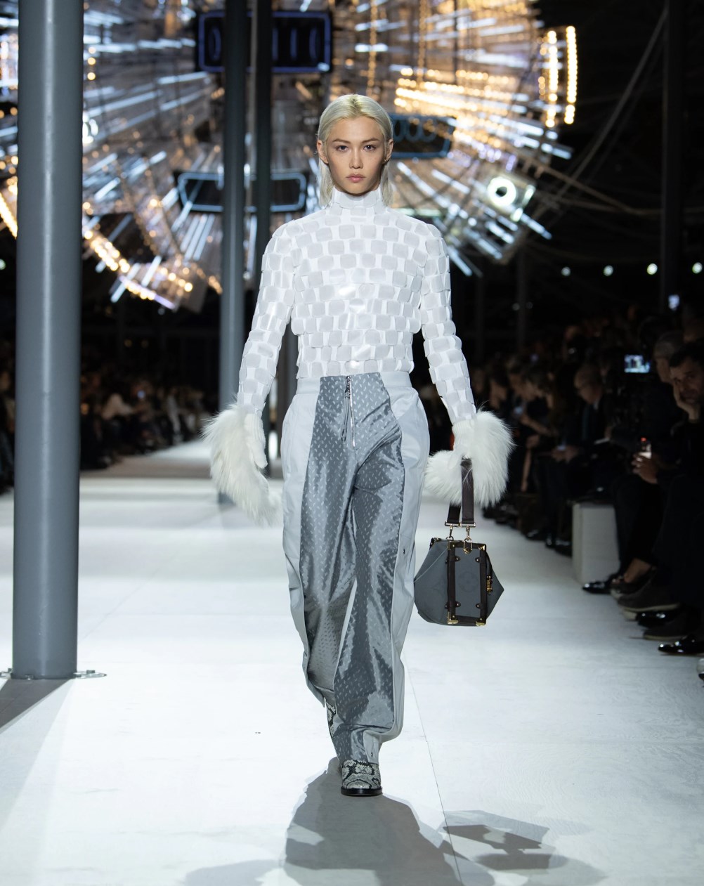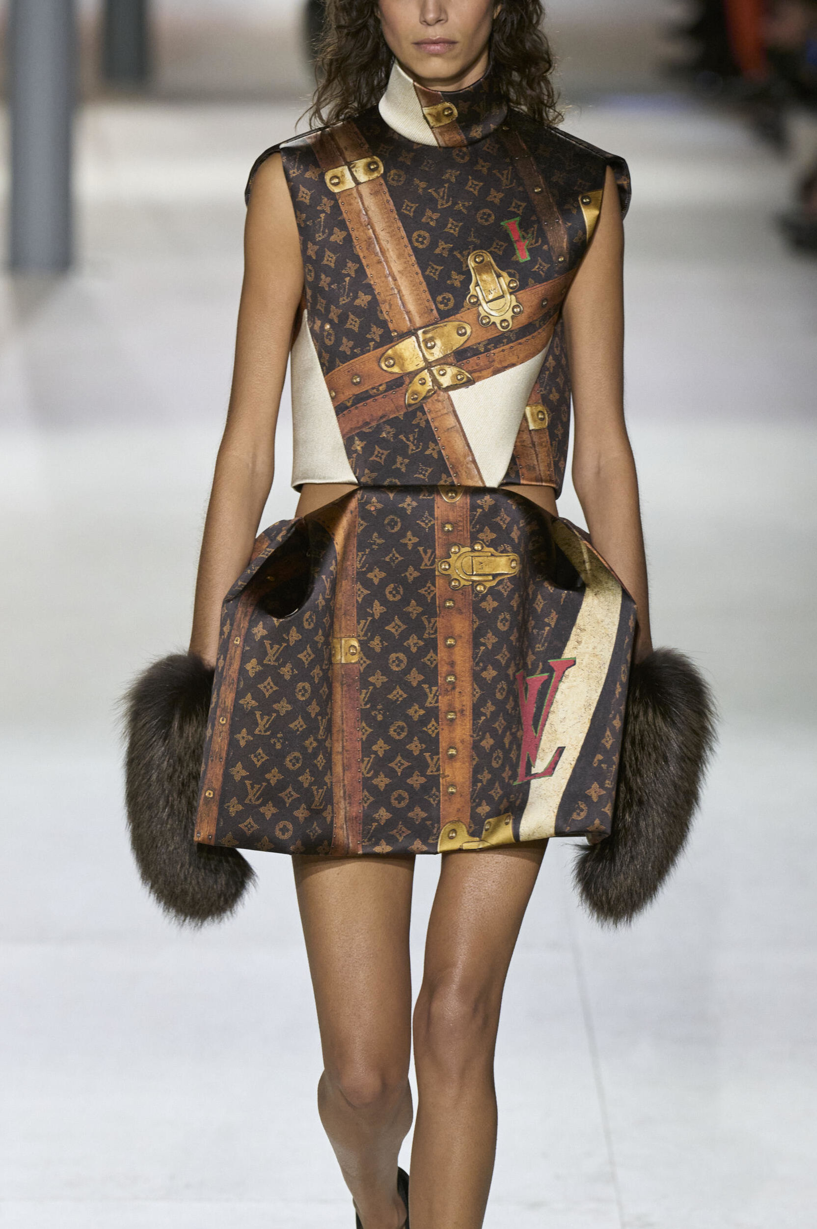 Louis Vuitton 2024 秋冬系列呈現出濃厚的未來主義感,以品牌標誌為靈感,運用圖形圖案、飾有大量金屬線的光澤刺繡、浮誇的羽毛裝飾和精緻前衛的配件,結合出一場致敬過去、展望未來的精彩演出。