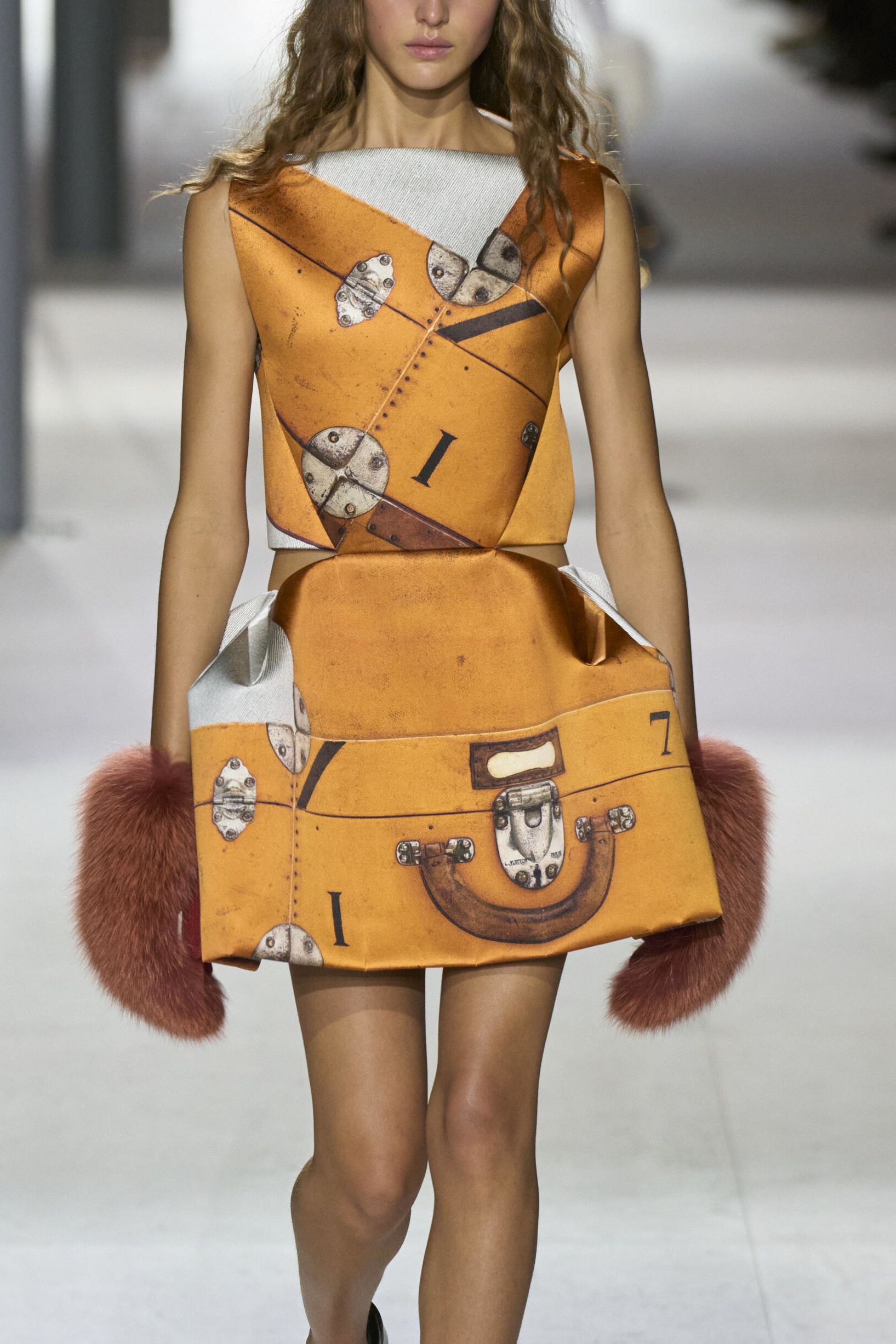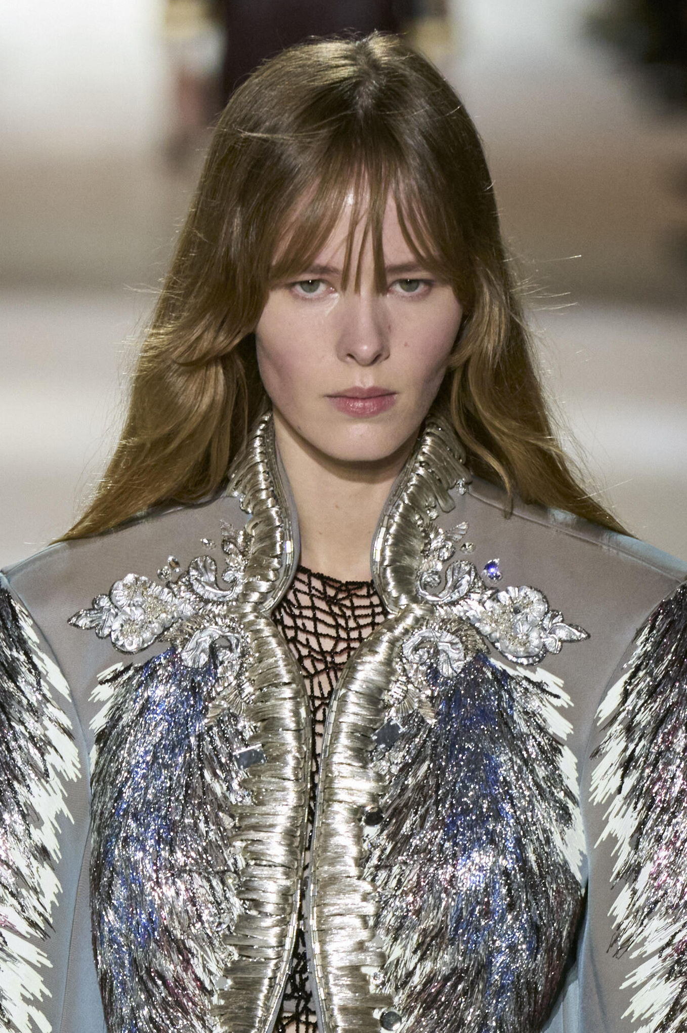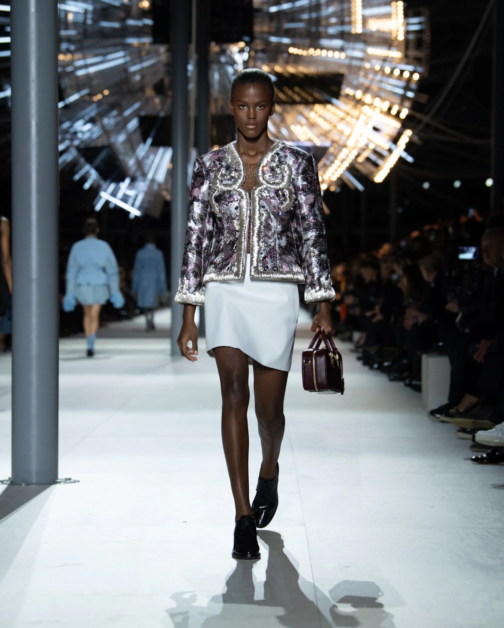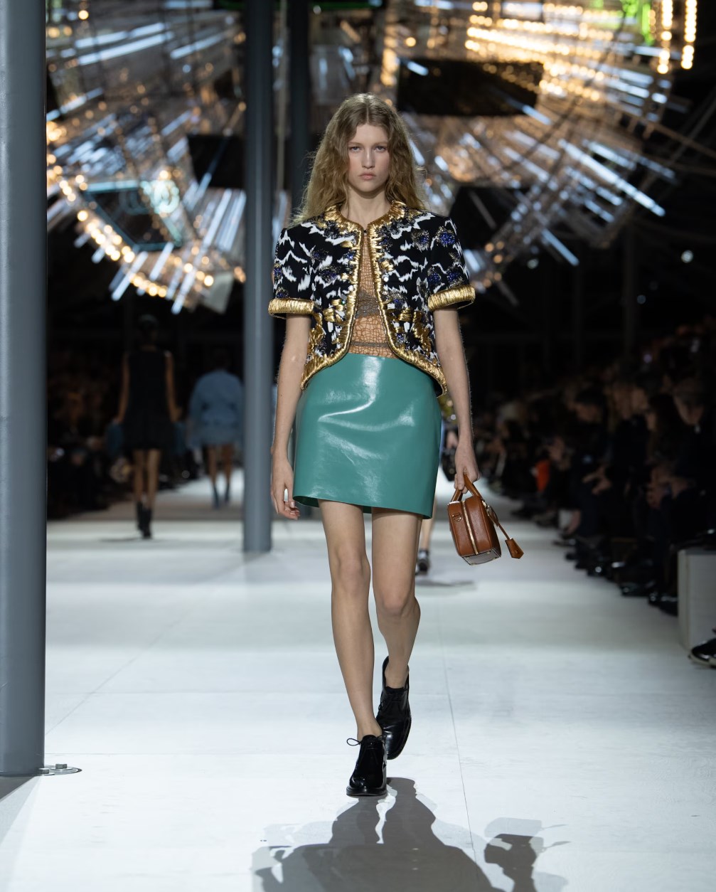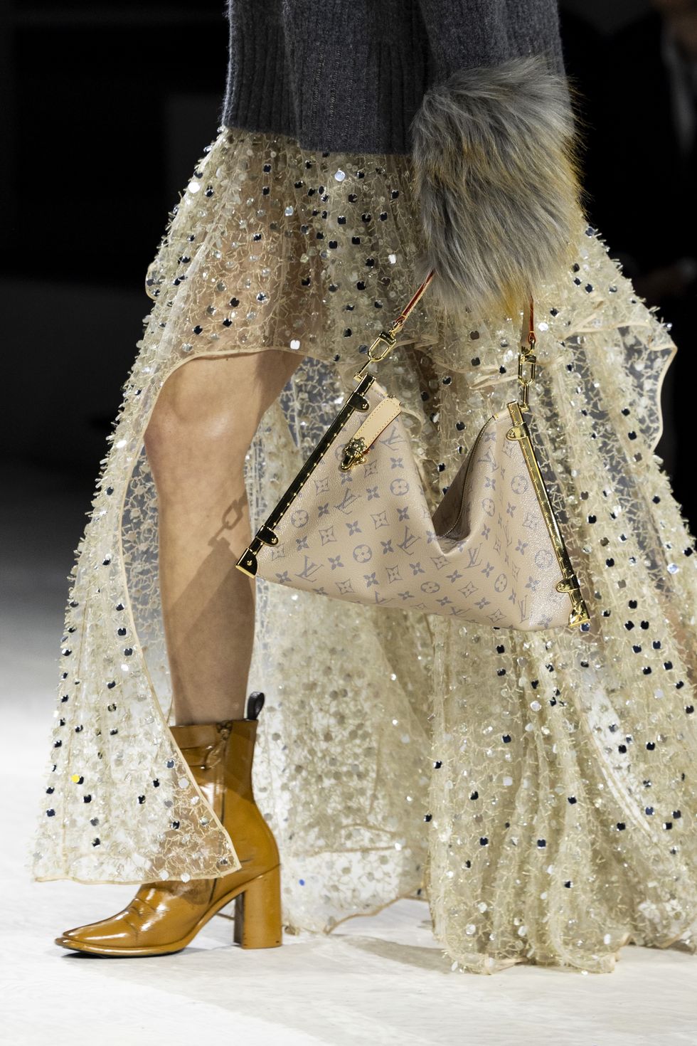 Louis Vuitton 2024 秋冬系列呈現出濃厚的未來主義感,以品牌標誌為靈感,運用圖形圖案、飾有大量金屬線的光澤刺繡、浮誇的羽毛裝飾和精緻前衛的配件,結合出一場致敬過去、展望未來的精彩演出。