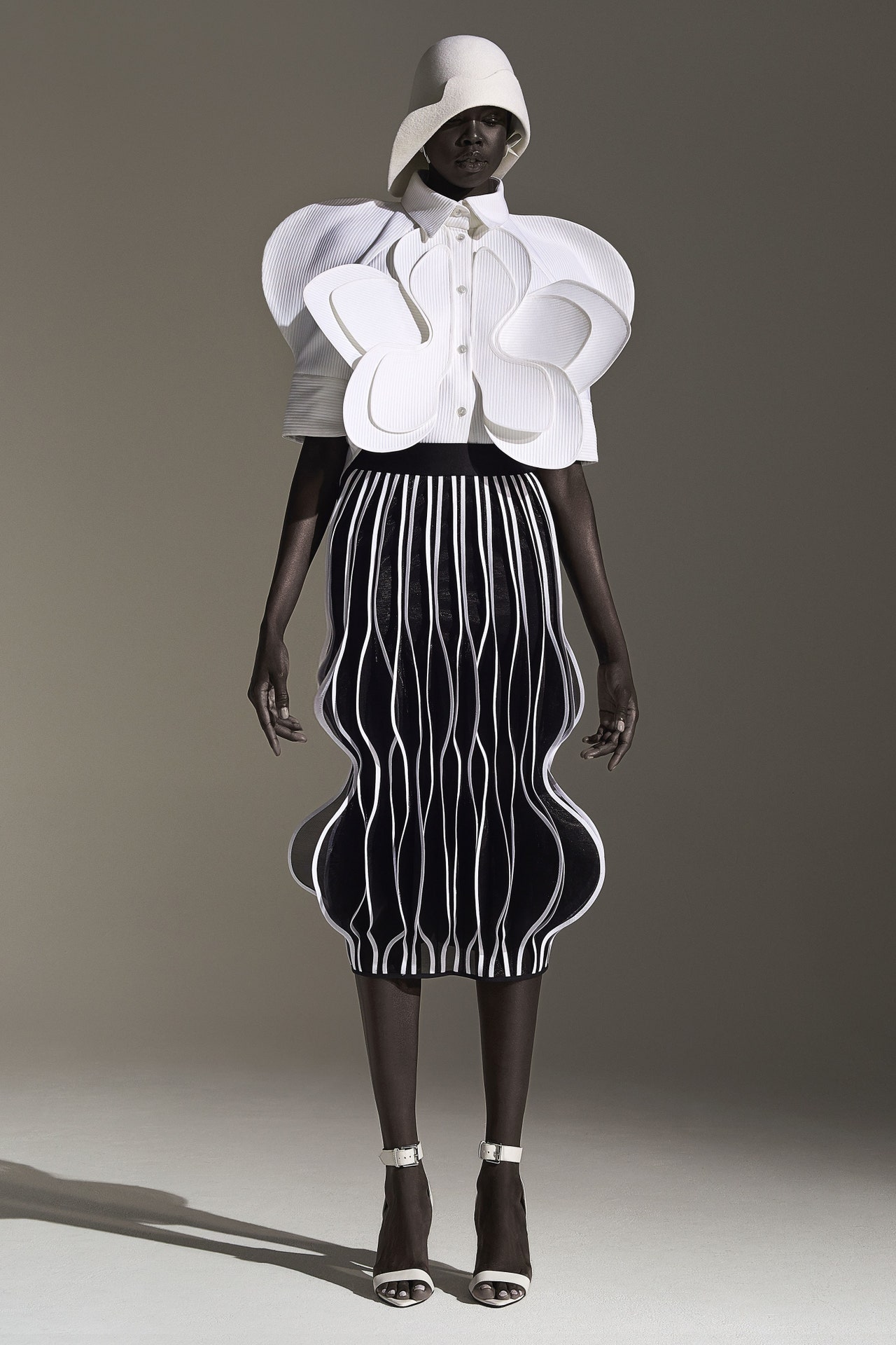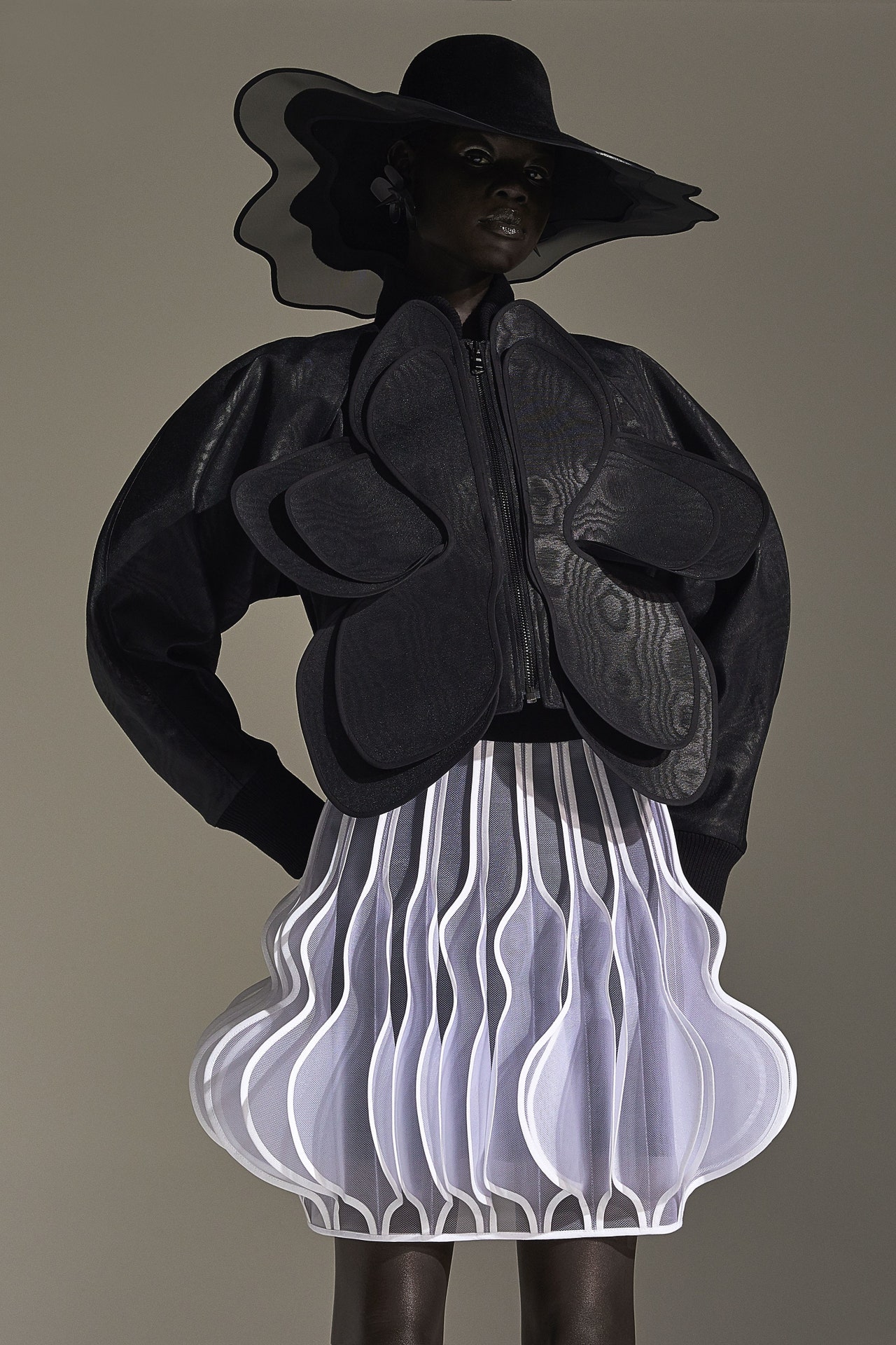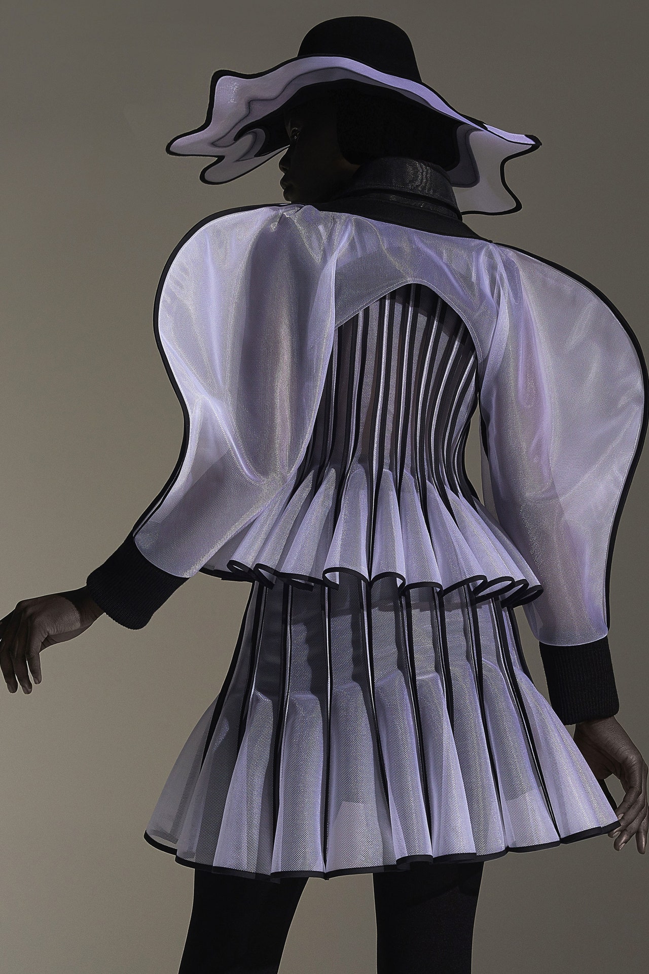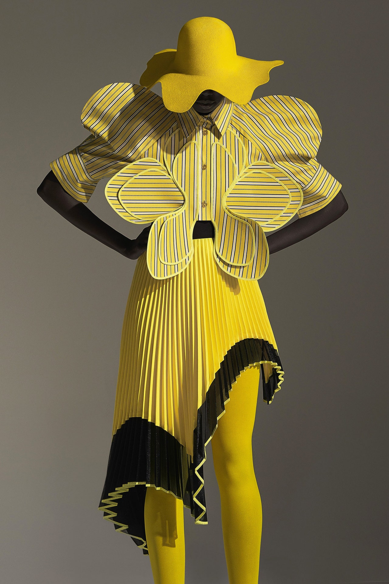 特殊的立體結構如花綻放,層疊百摺蕩漾出波紋效果。 波點、條紋印花交錯和傘型波浪結構的融合,形成視覺錯視的微妙迷幻感。 傳遞知識的 #副料大學