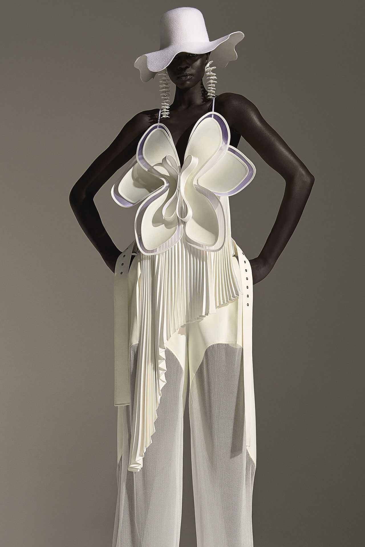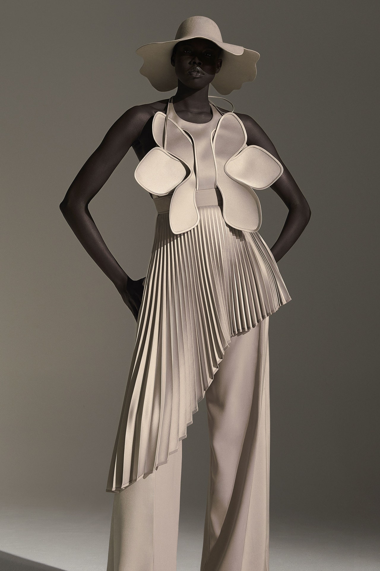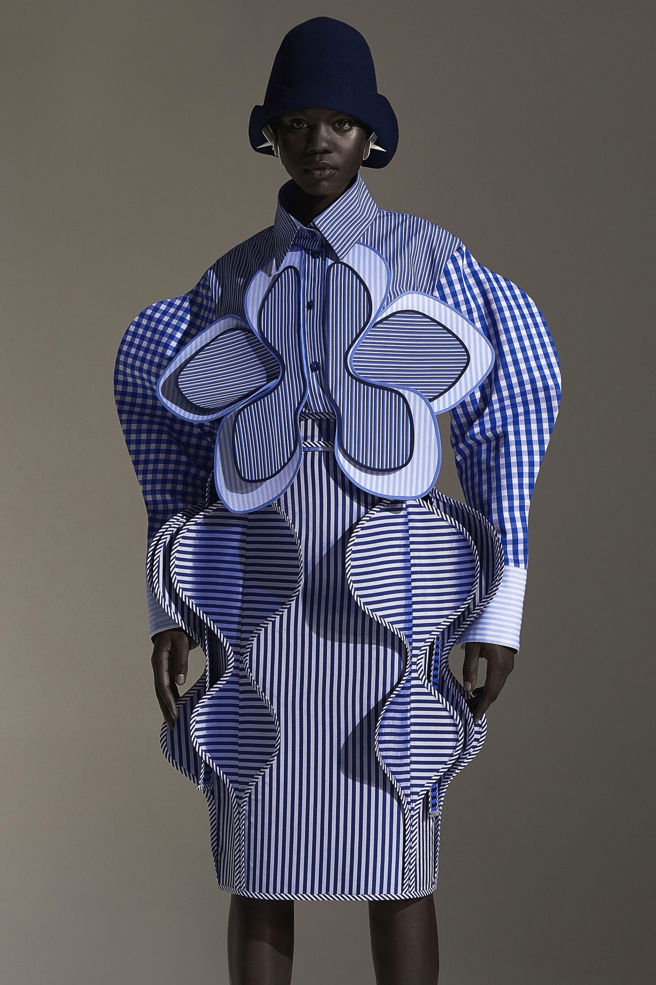 特殊的立體結構如花綻放,層疊百摺蕩漾出波紋效果。 波點、條紋印花交錯和傘型波浪結構的融合,形成視覺錯視的微妙迷幻感。 傳遞知識的 #副料大學