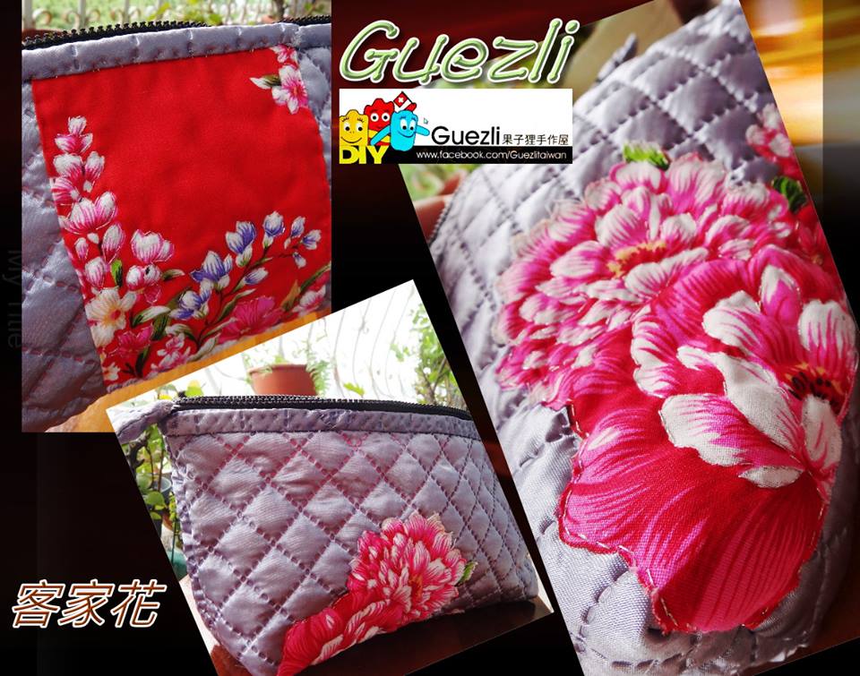 關於客家花布說法:一是客家人以前很窮,只能撿一些別人家剩下的布來拼湊成衣物、背包……等等,而從各家聚集而來的布料自然成了花花綠綠的用品了形成客家花布;另一種說法是花仙娘娘為了感謝客家人的辛勞,便利用許多花的色汁來染成花花綠綠的頭巾、笠巾等飾品來裝飾客家人,因此客家才會有花布的文化。