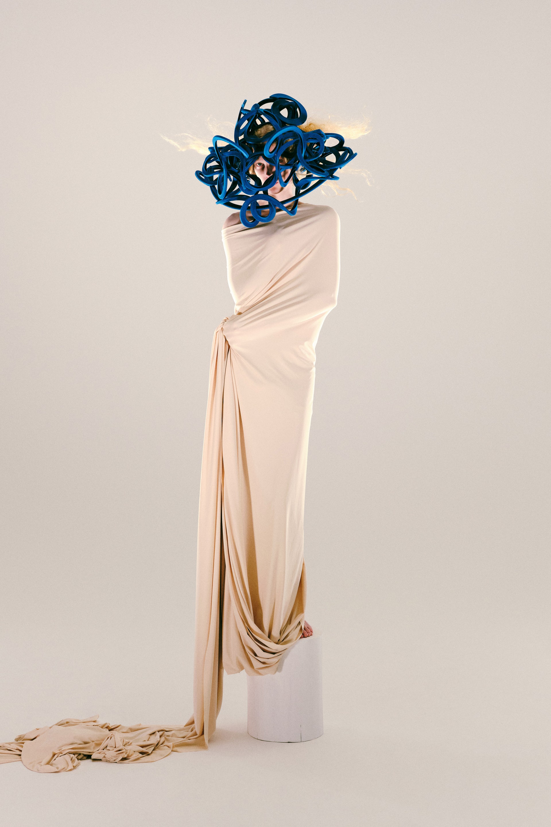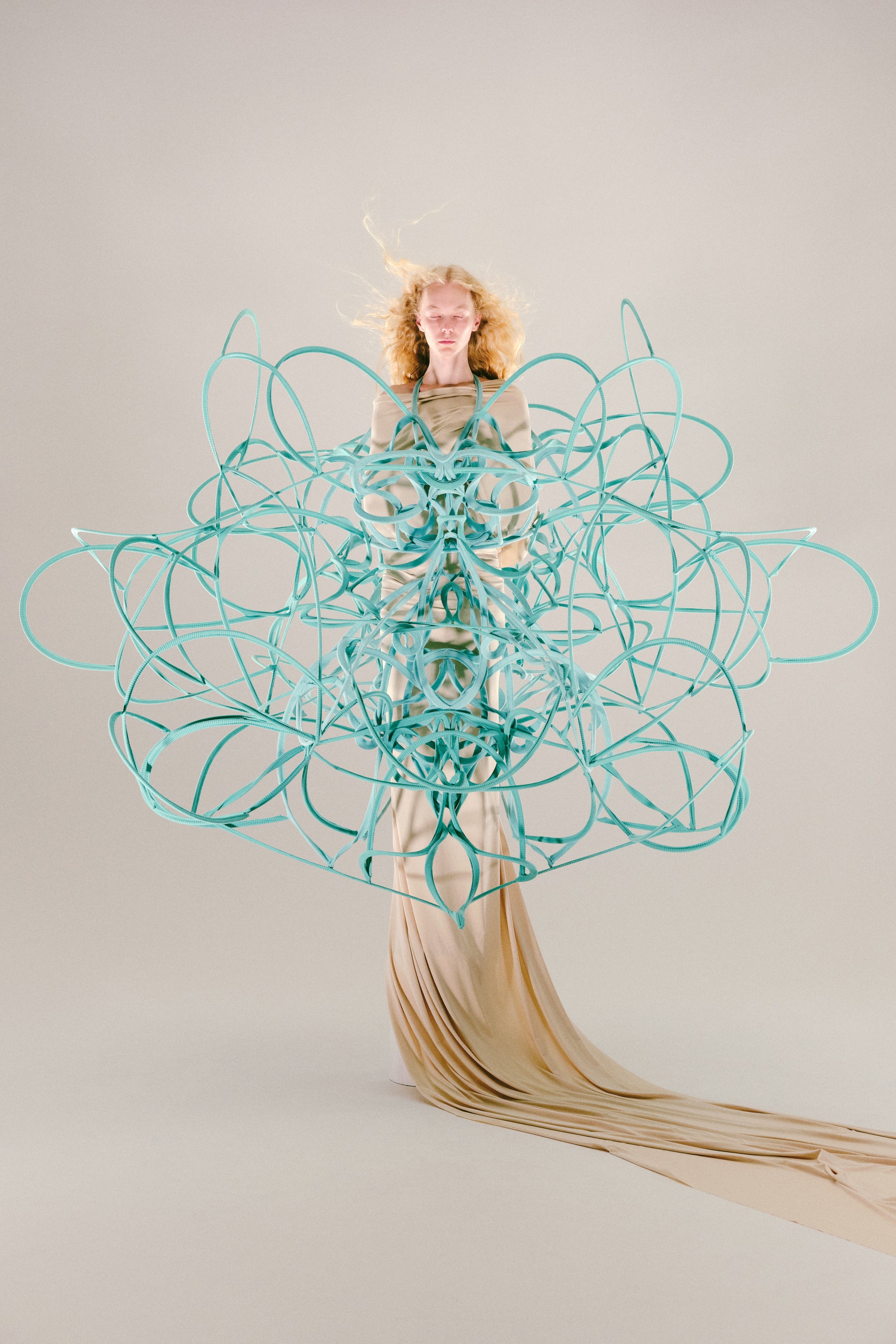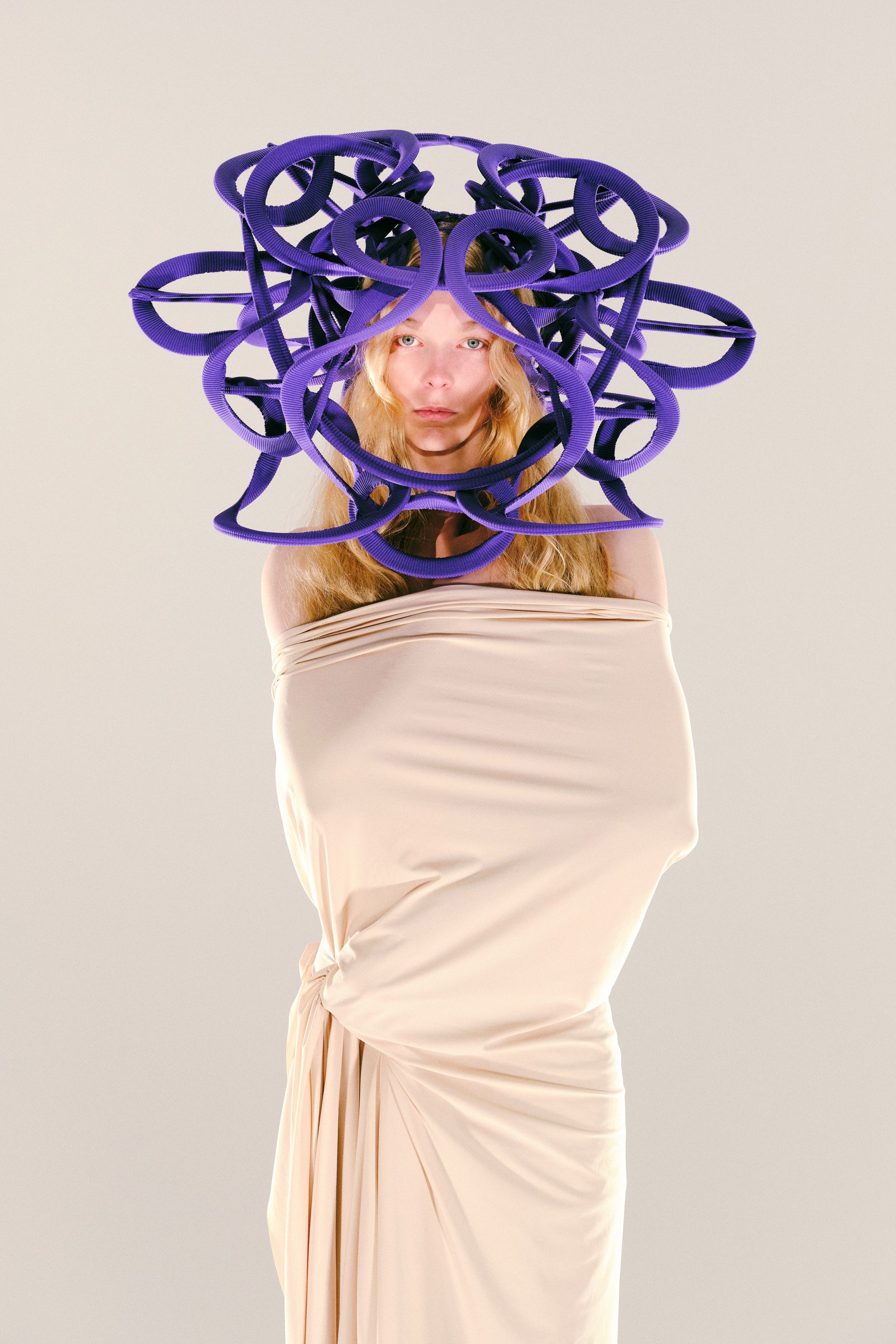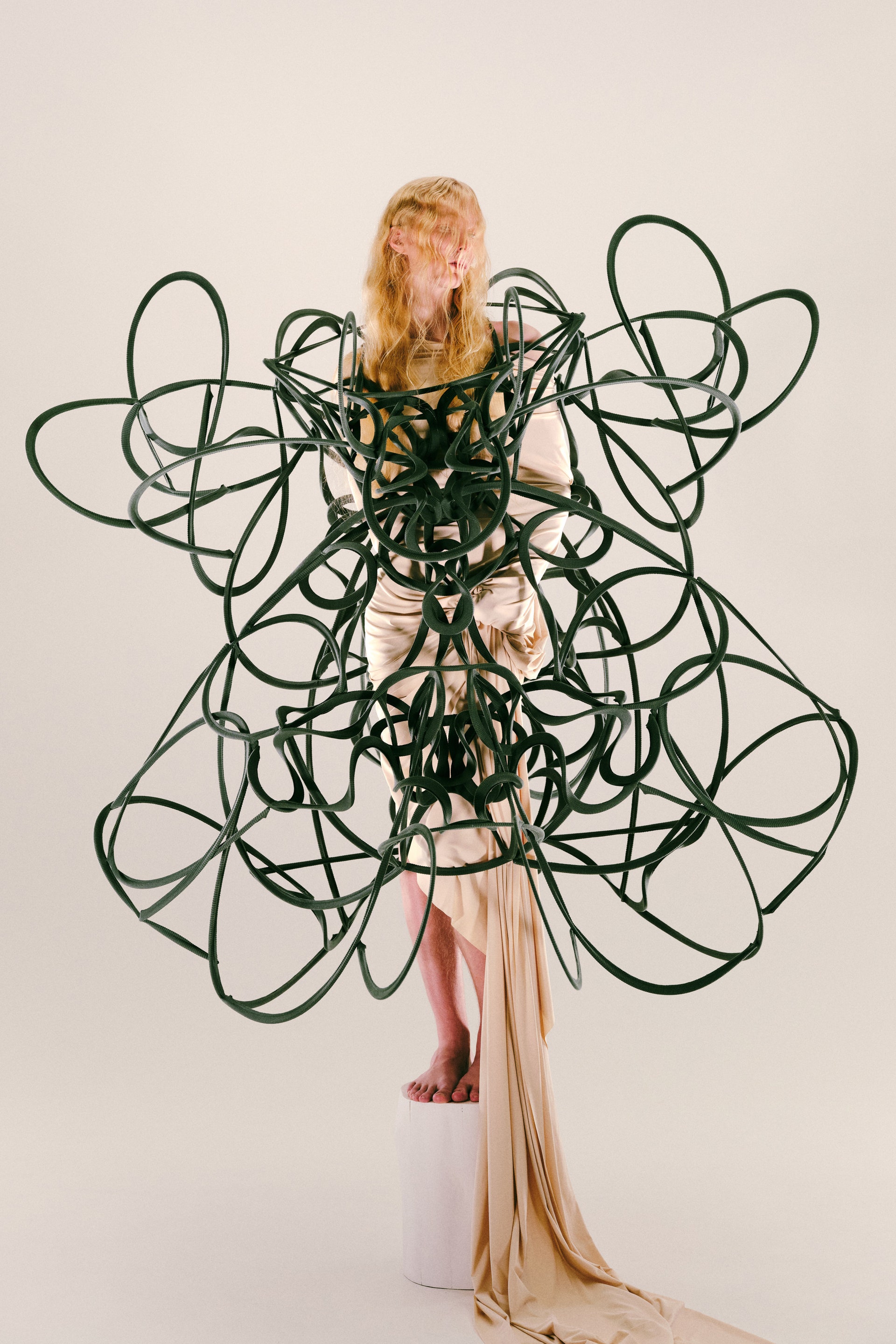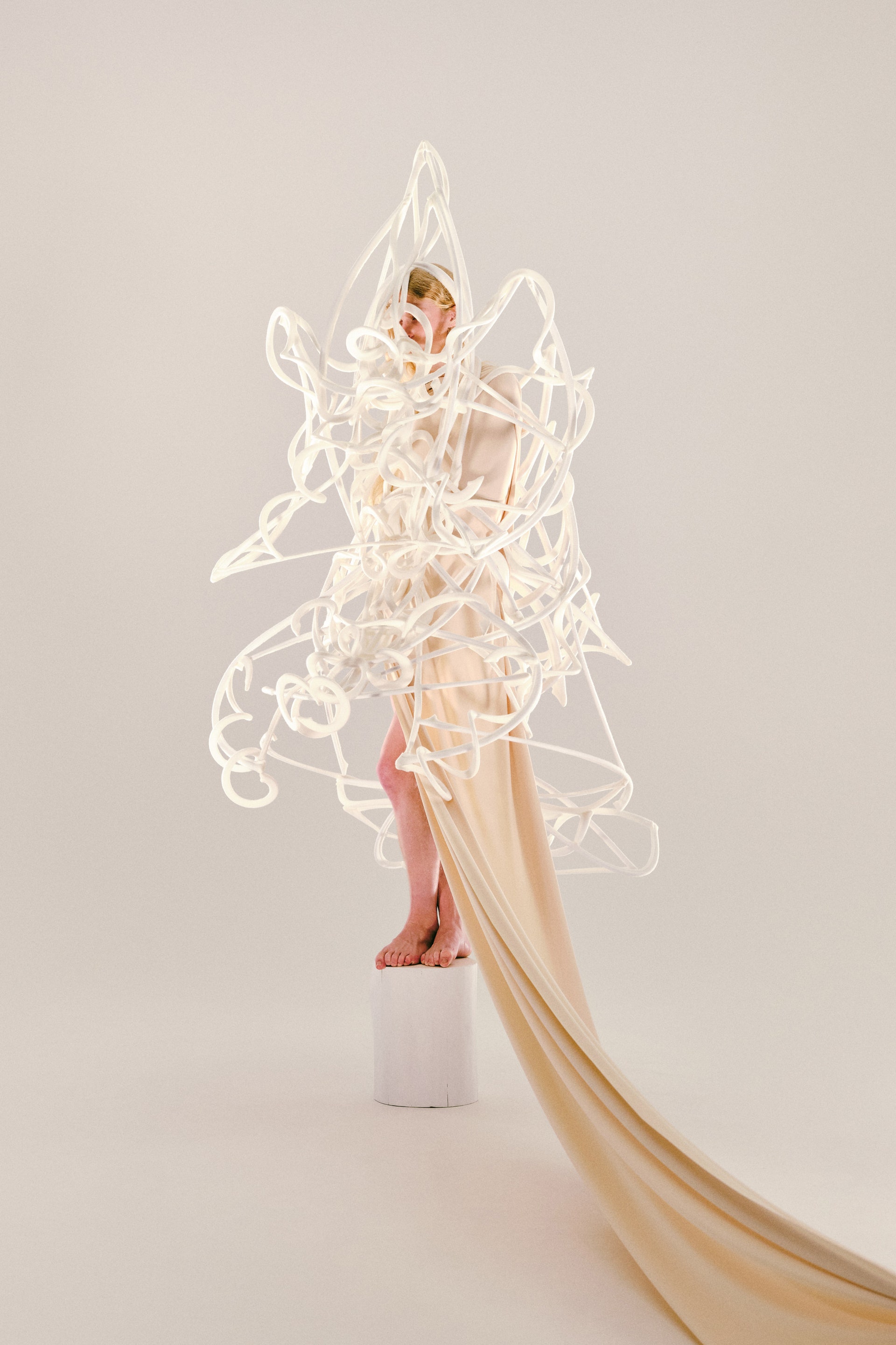 這是岡崎龍之介時隔 18 個月推出的系列《002》,在此系列中,他以古希臘雕像的大理石帷幔為起點。 “雕塑中的懸垂展示了人與布料之間自古以來延續的關係,所以我採取了現代的方法,而不是用布料來製作雕塑,”他解釋道。 在該系列的籌備階段,他一直在用木頭製作幾何雕塑,並談到使用較硬的介質如何讓他對織物的柔韌性有了新的認識。 值得注意的是,岡崎並沒有事先畫出他的設計草圖,甚至沒有想像成品;相反,他讓雙手下意識地完成這項工作,將塑膠杆穿過織物的空洞,讓它們形成對稱的形狀。 #傳遞知識的副料大學
