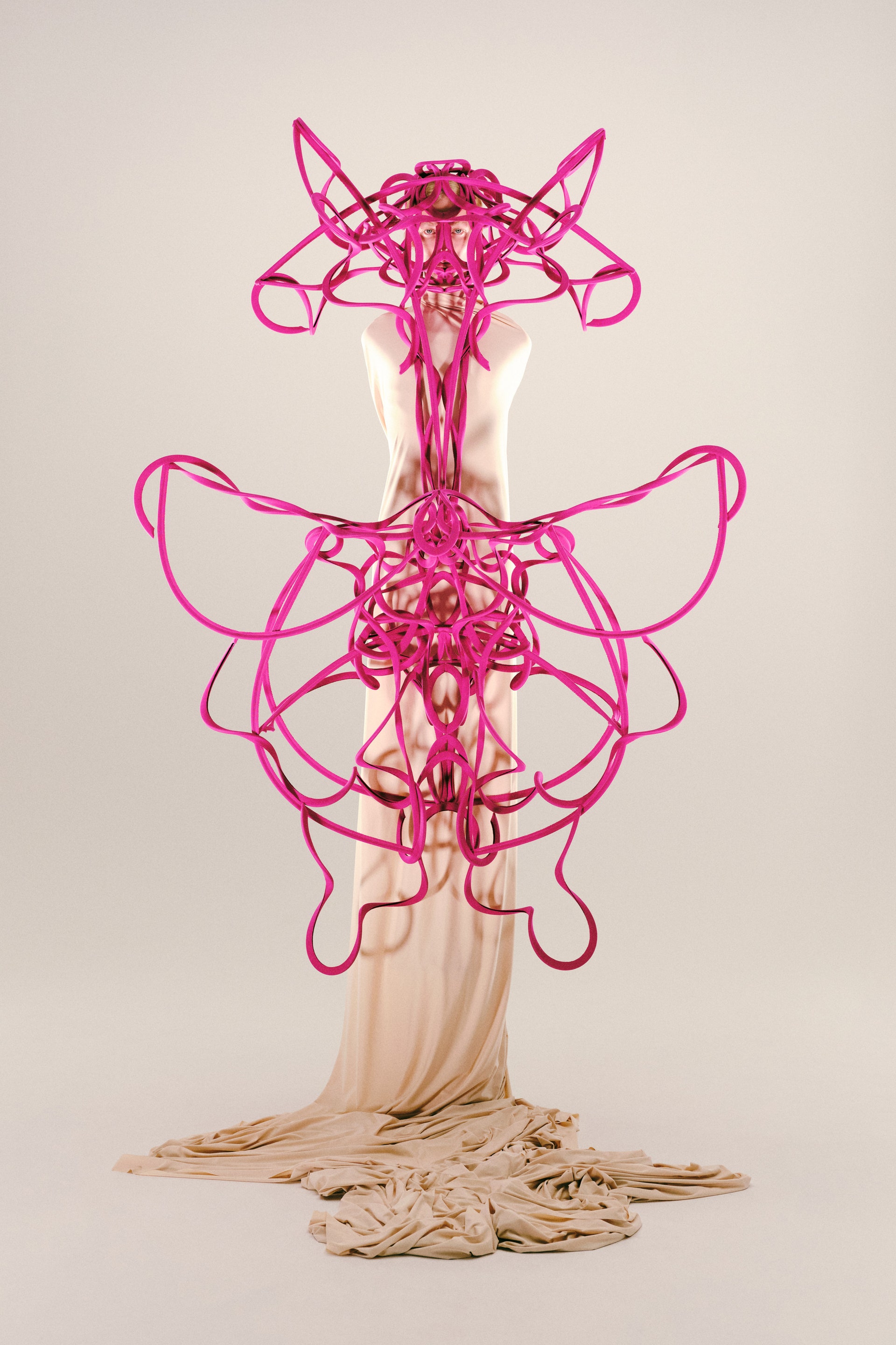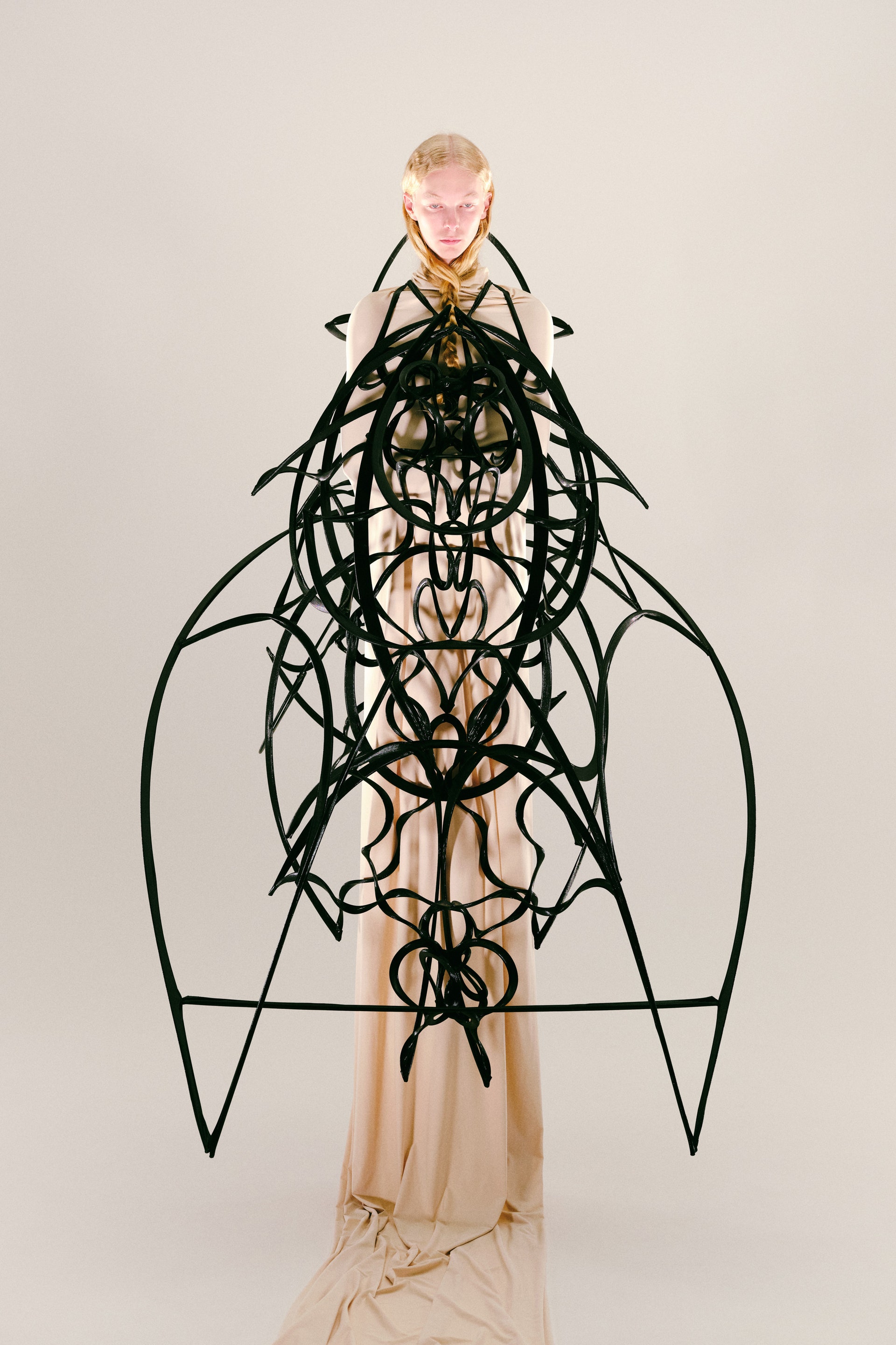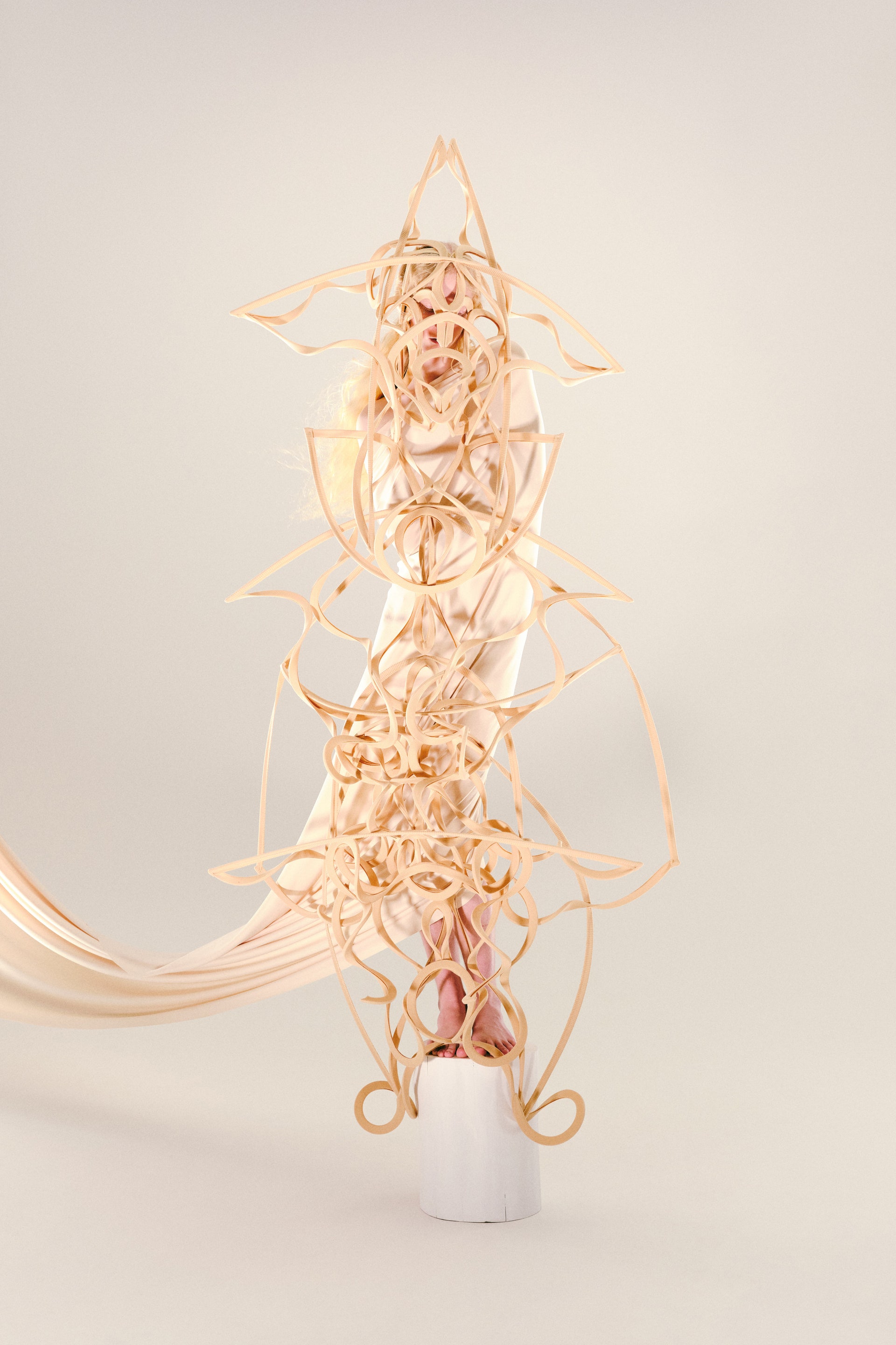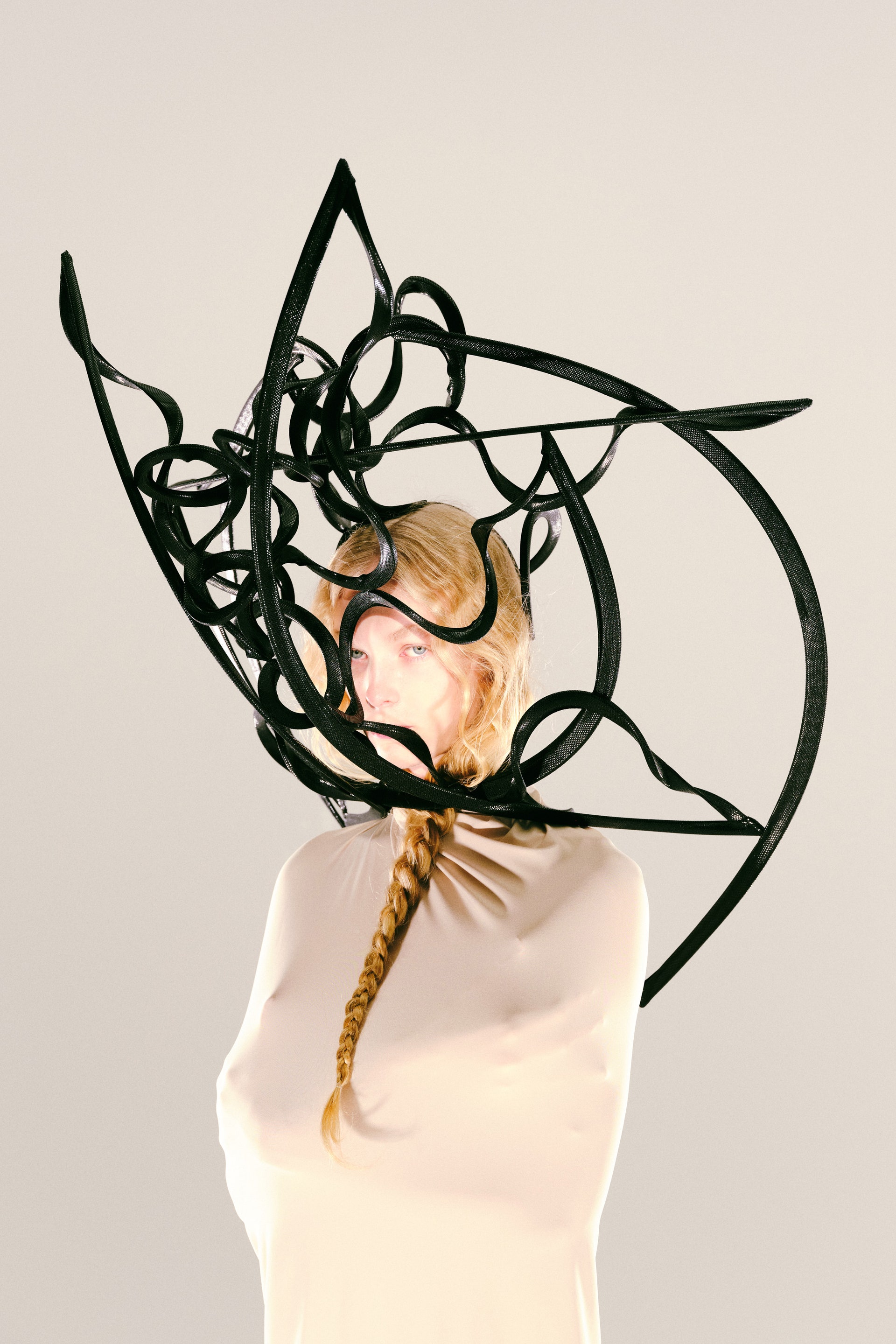 這是岡崎龍之介時隔 18 個月推出的系列《002》,在此系列中,他以古希臘雕像的大理石帷幔為起點。 “雕塑中的懸垂展示了人與布料之間自古以來延續的關係,所以我採取了現代的方法,而不是用布料來製作雕塑,”他解釋道。 在該系列的籌備階段,他一直在用木頭製作幾何雕塑,並談到使用較硬的介質如何讓他對織物的柔韌性有了新的認識。 值得注意的是,岡崎並沒有事先畫出他的設計草圖,甚至沒有想像成品;相反,他讓雙手下意識地完成這項工作,將塑膠杆穿過織物的空洞,讓它們形成對稱的形狀。 #傳遞知識的副料大學