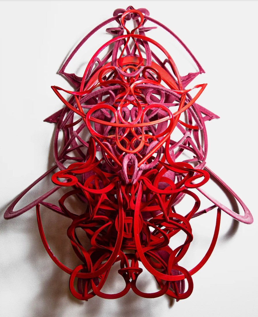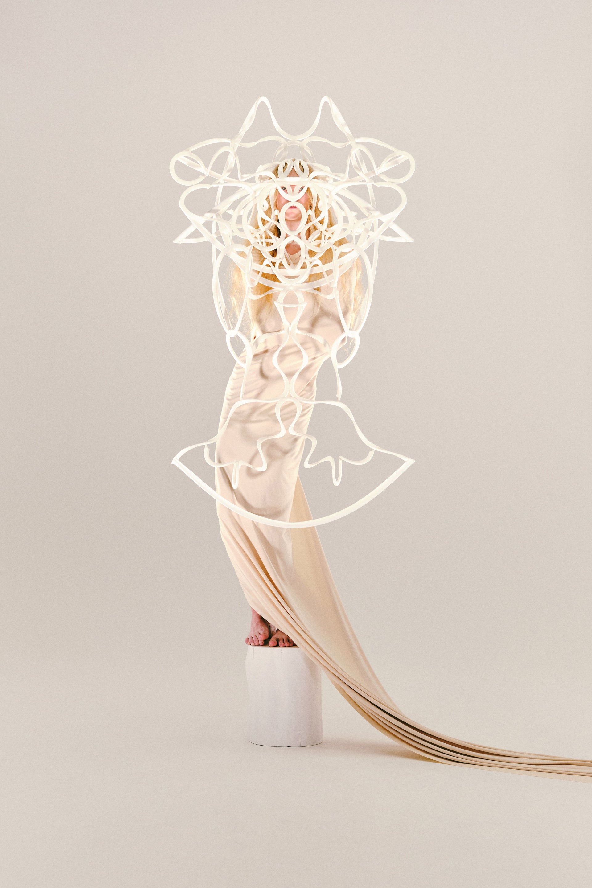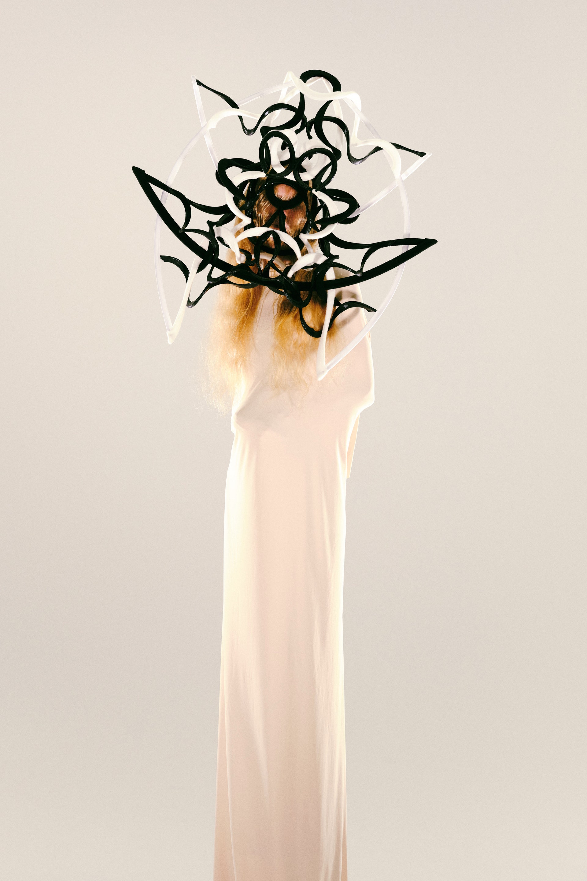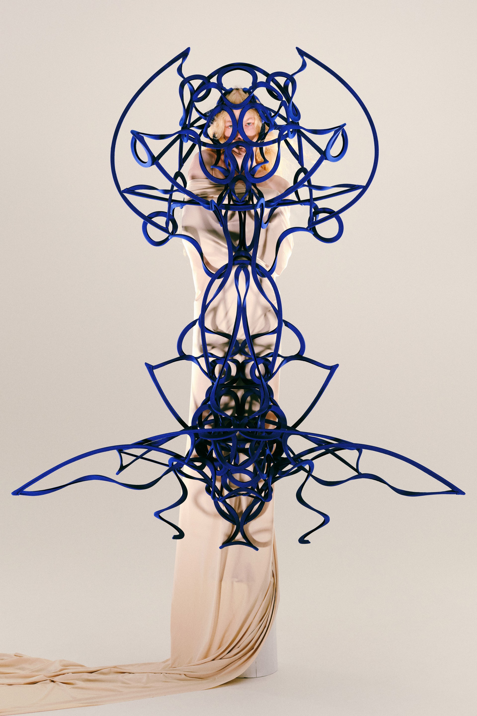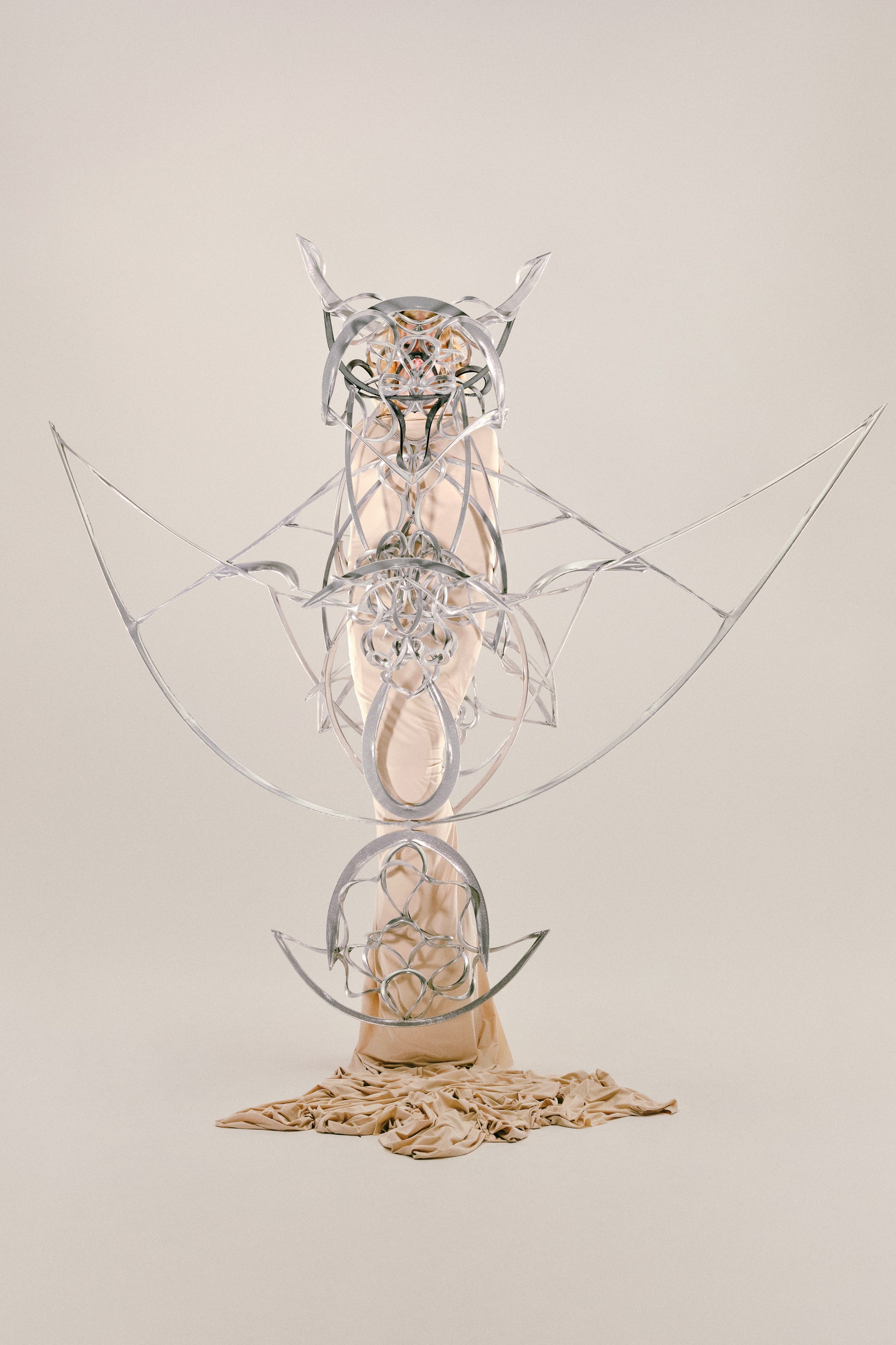 這是岡崎龍之介時隔 18 個月推出的系列《002》,在此系列中,他以古希臘雕像的大理石帷幔為起點。 “雕塑中的懸垂展示了人與布料之間自古以來延續的關係,所以我採取了現代的方法,而不是用布料來製作雕塑,”他解釋道。 在該系列的籌備階段,他一直在用木頭製作幾何雕塑,並談到使用較硬的介質如何讓他對織物的柔韌性有了新的認識。 值得注意的是,岡崎並沒有事先畫出他的設計草圖,甚至沒有想像成品;相反,他讓雙手下意識地完成這項工作,將塑膠杆穿過織物的空洞,讓它們形成對稱的形狀。 #傳遞知識的副料大學