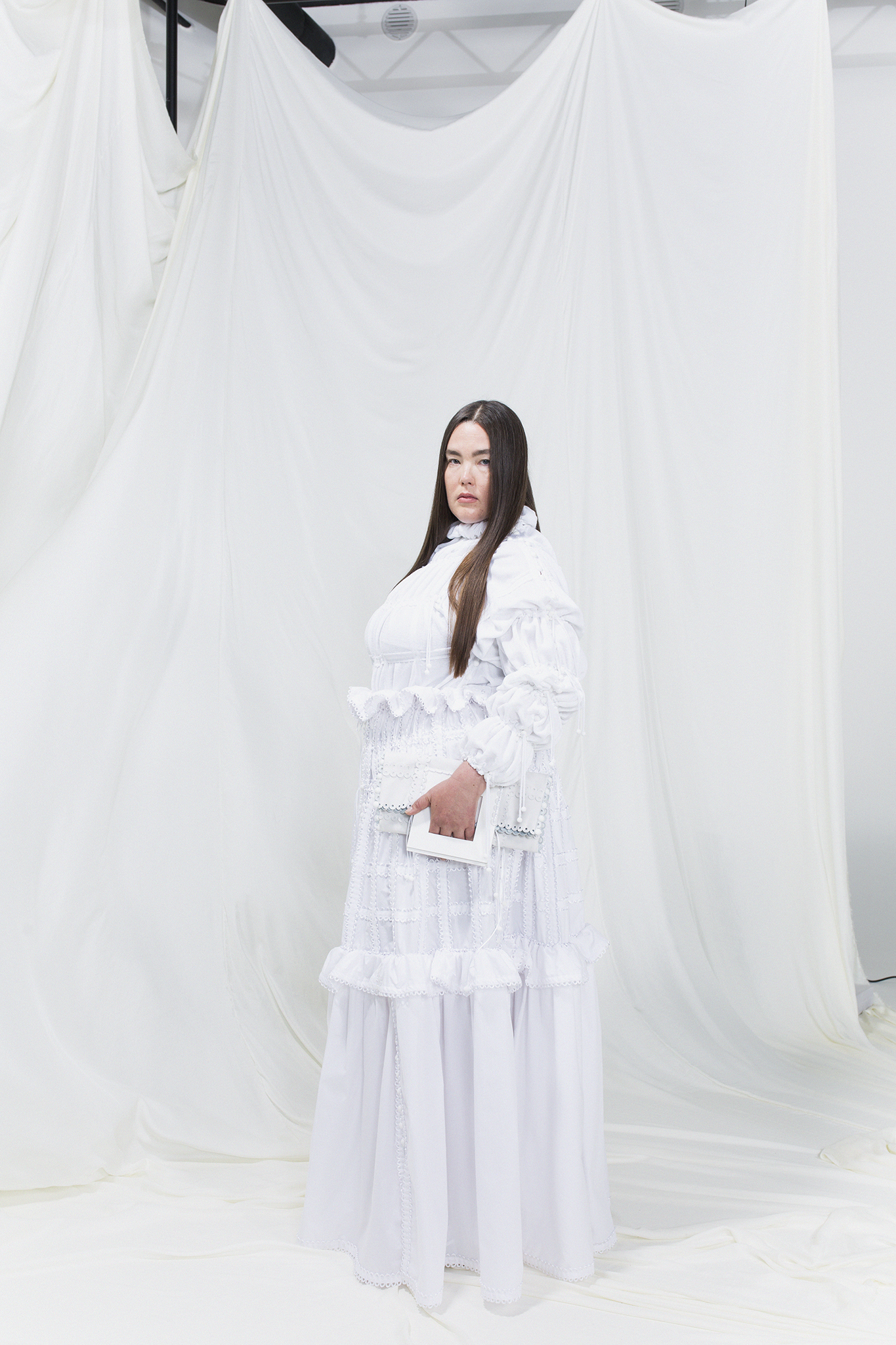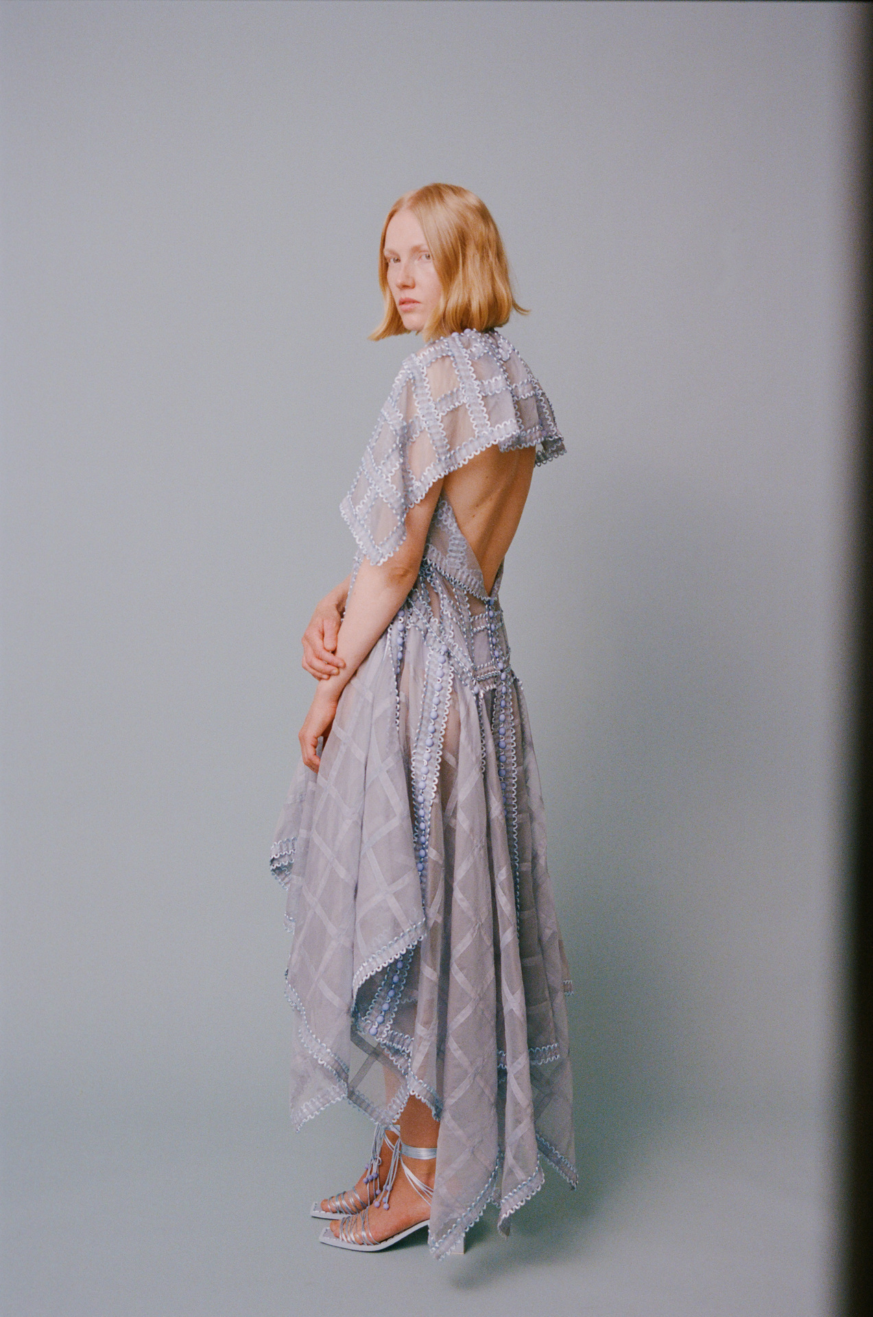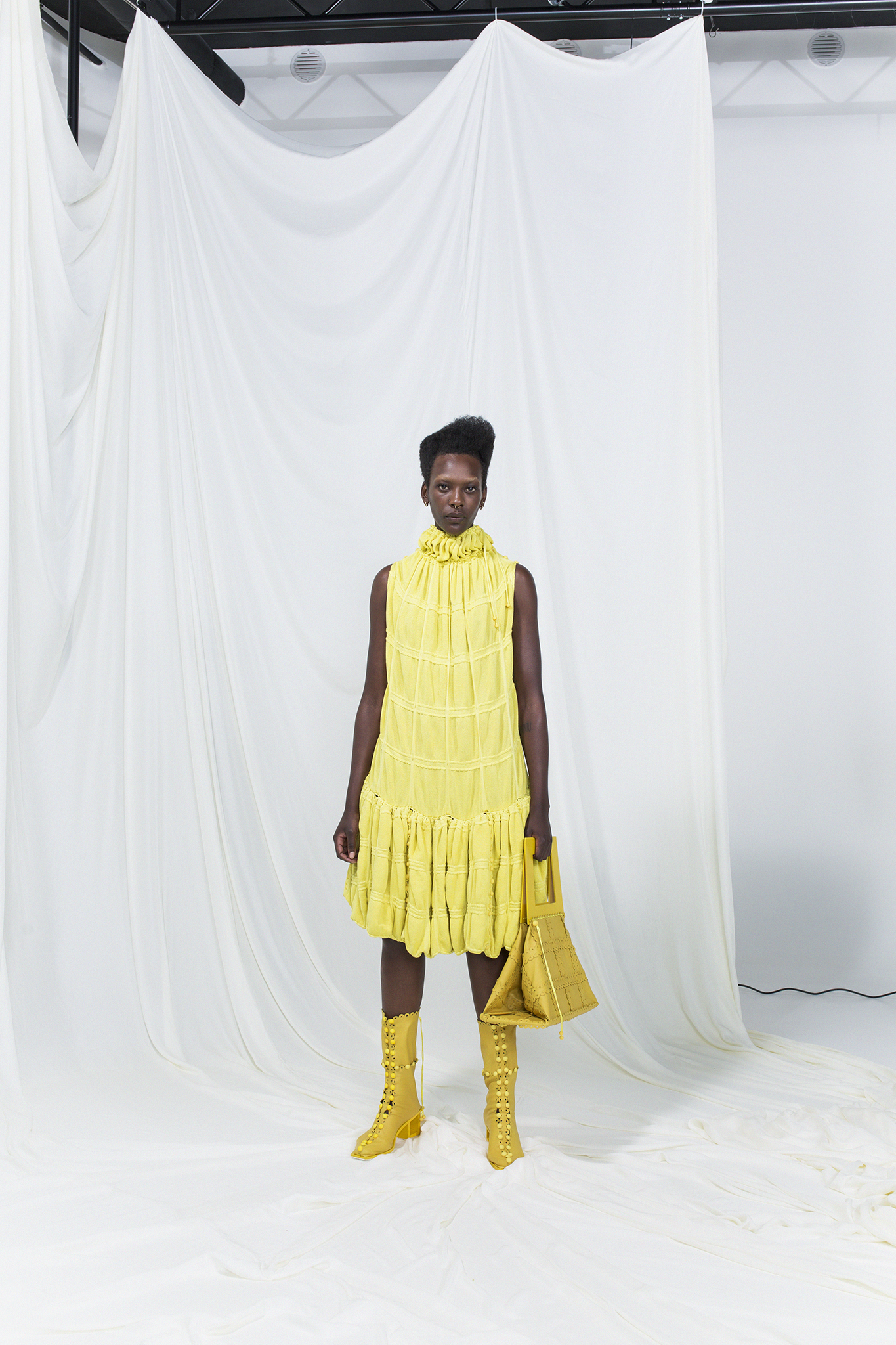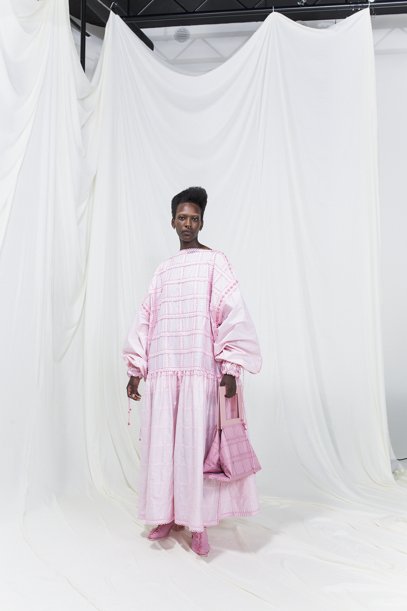 該系列的服裝採用相同尺寸的方形模塊創建,並通過鈕釦和扣環組裝在一起,無需縫合即可對款式進行無限的修改或轉換。