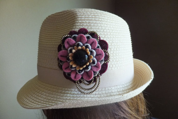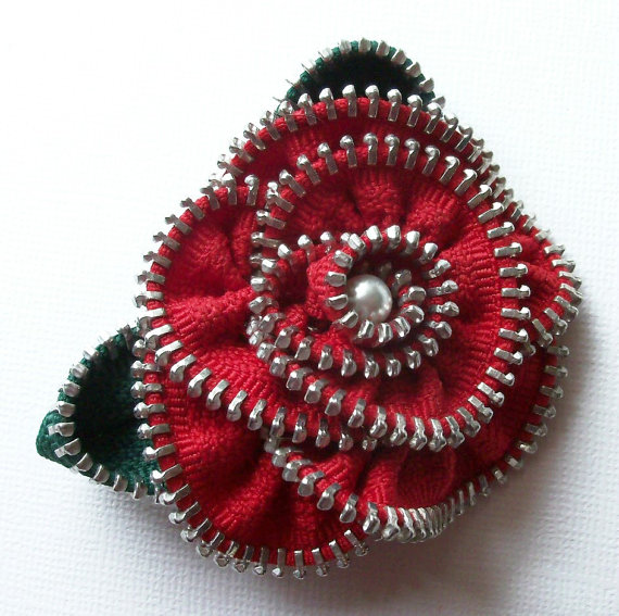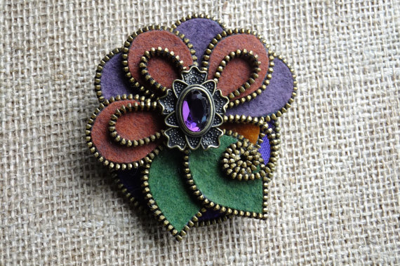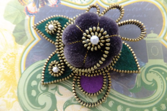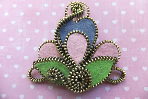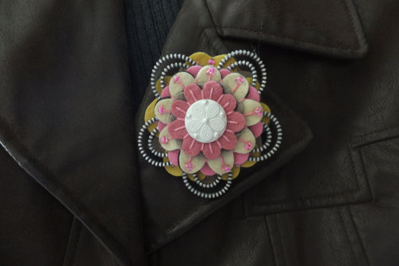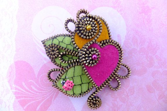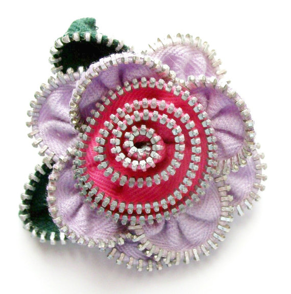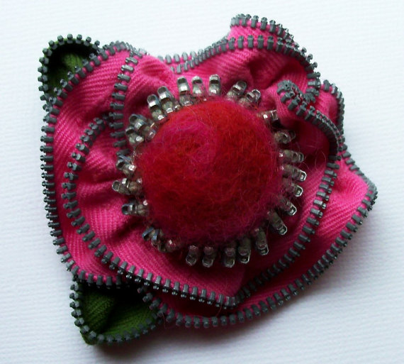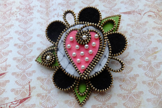 Flower with Heart Zipper Brooch for Coat Jacket Hat by MsLolaCreates