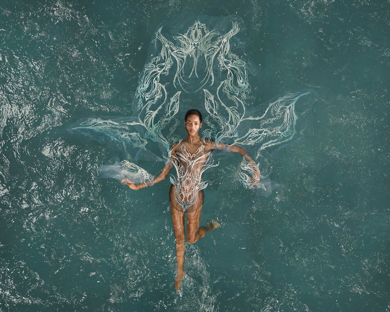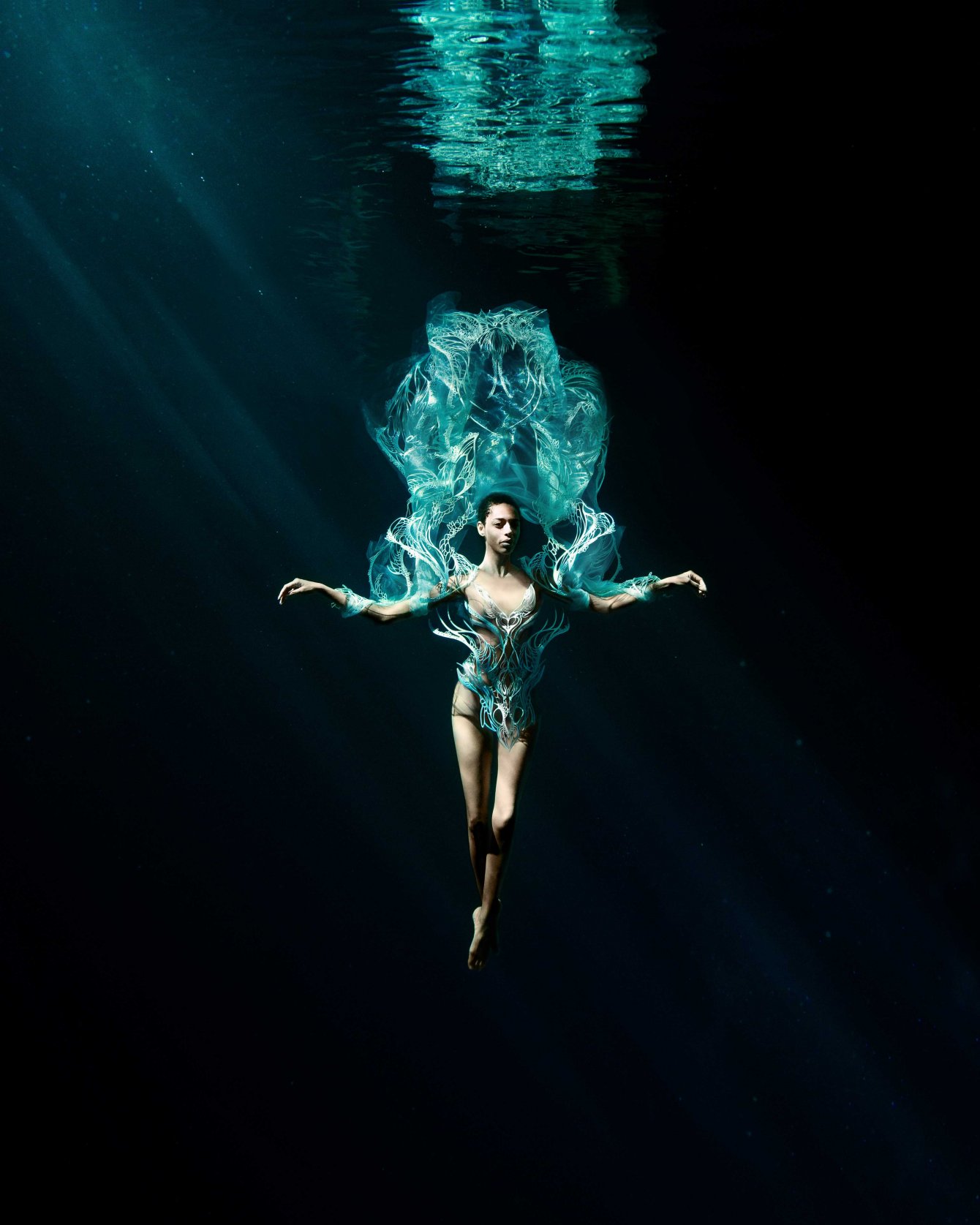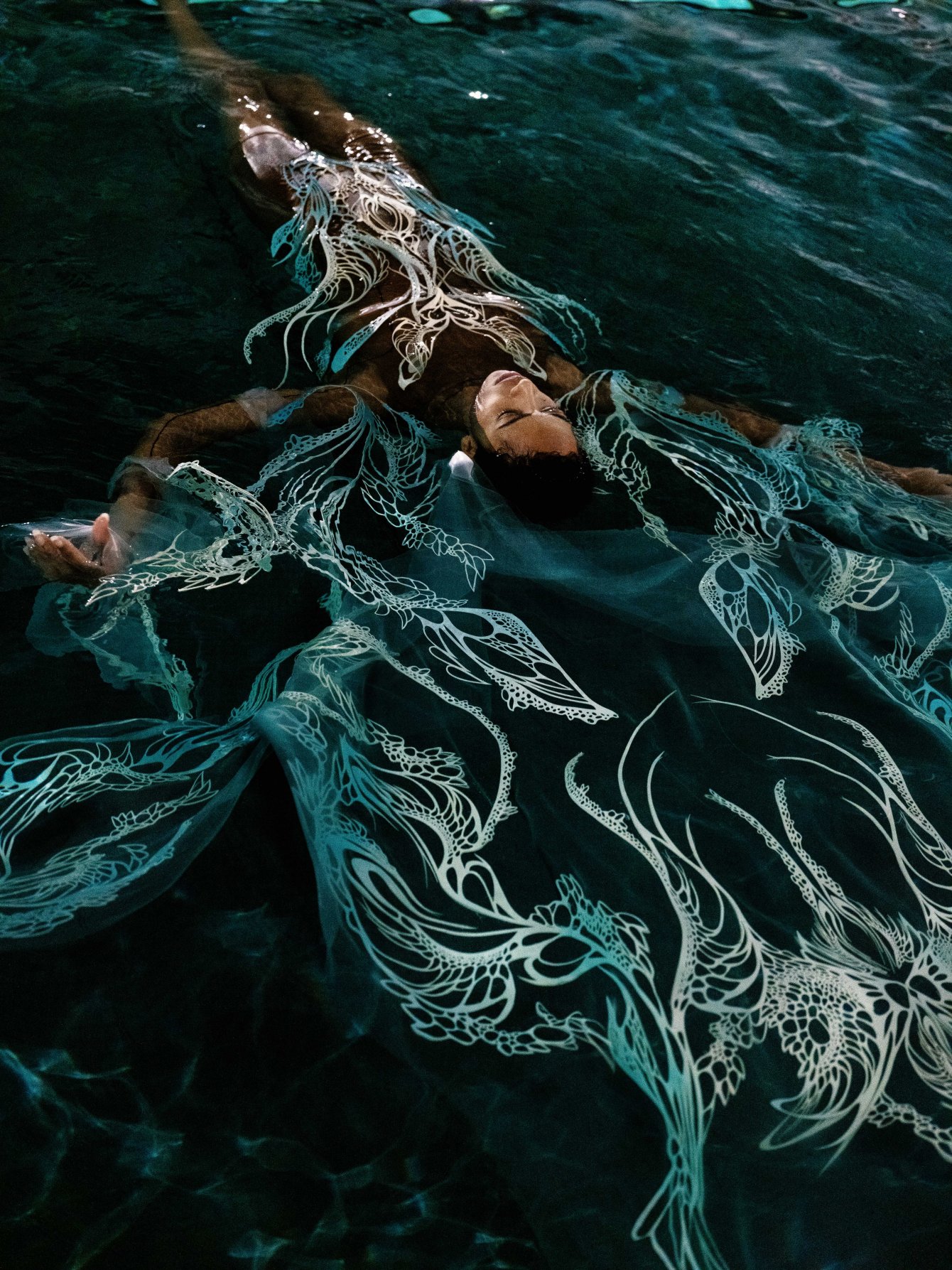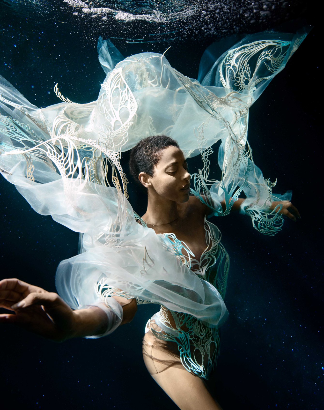 這位前衛創新的設計師和同樣多才多藝的法國舞蹈家、編舞家、水下電影製作人和自由潛水員 Julie Gautier 合作,透過舞者在水中舞動,服飾也隨之擺盪起伏,仿佛幻化成奇妙的海底生物。 Iris van herpen 2023 couture #傳遞知識的副料大學