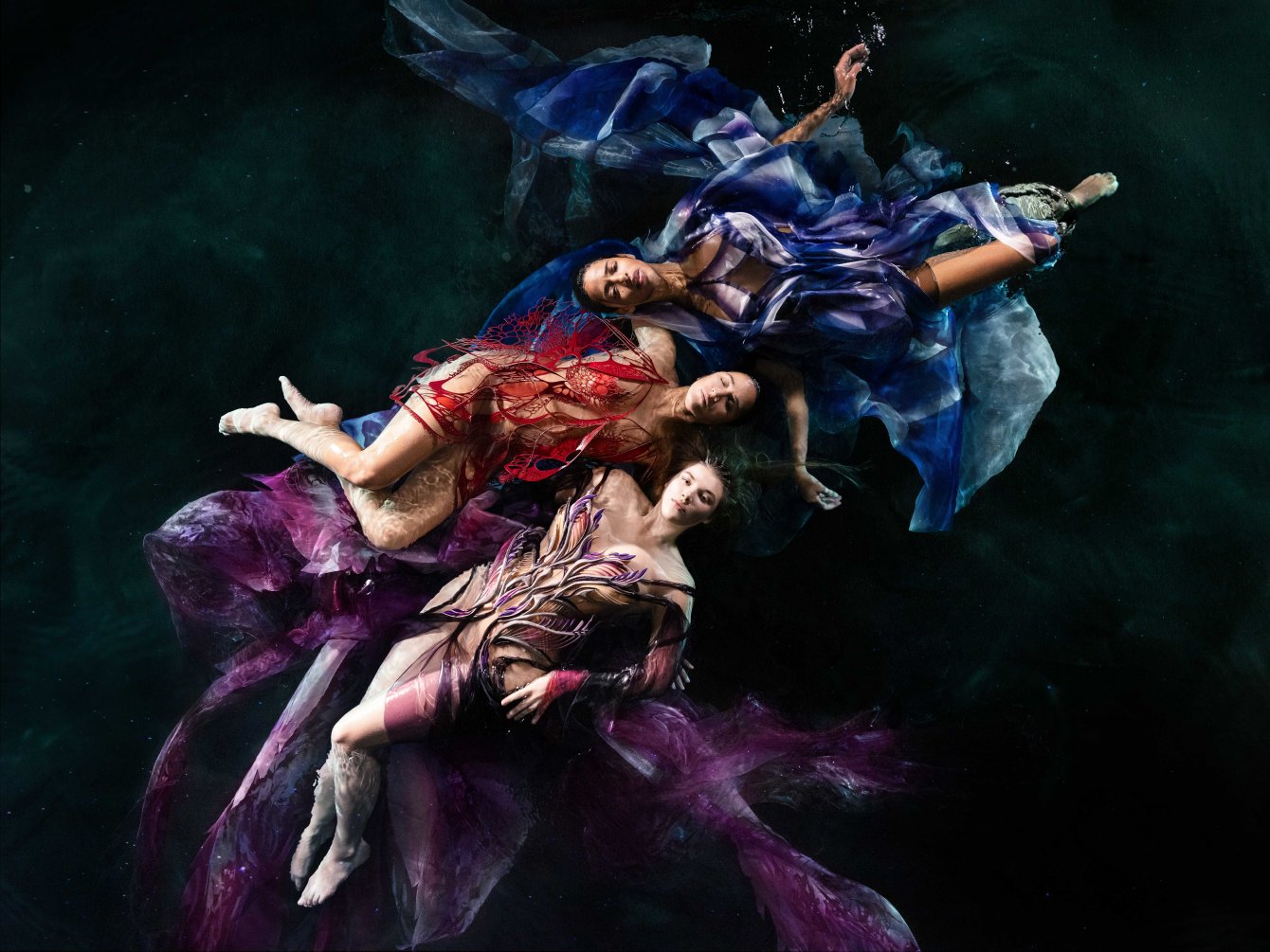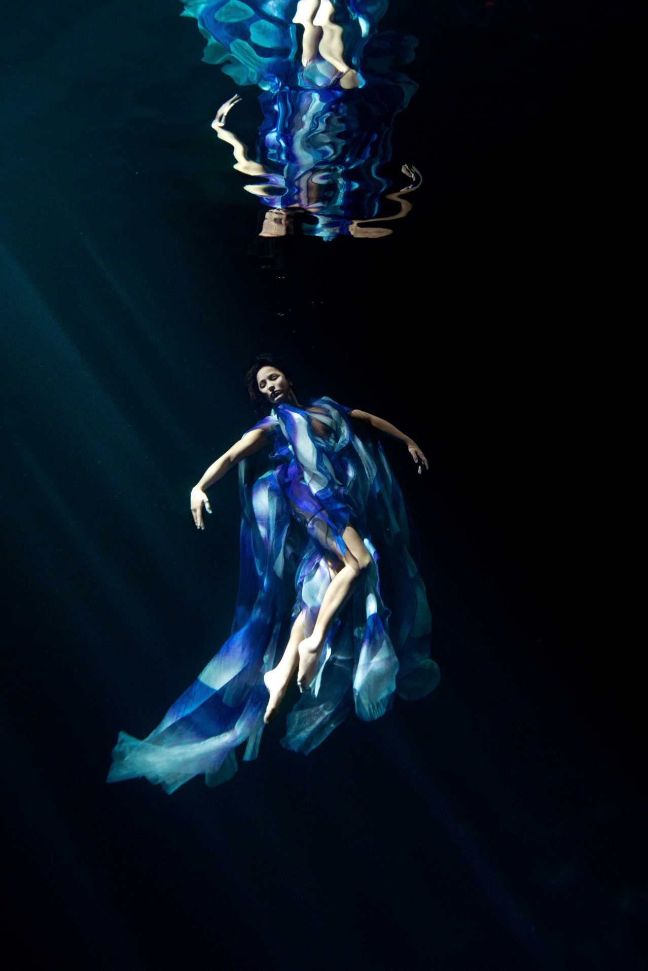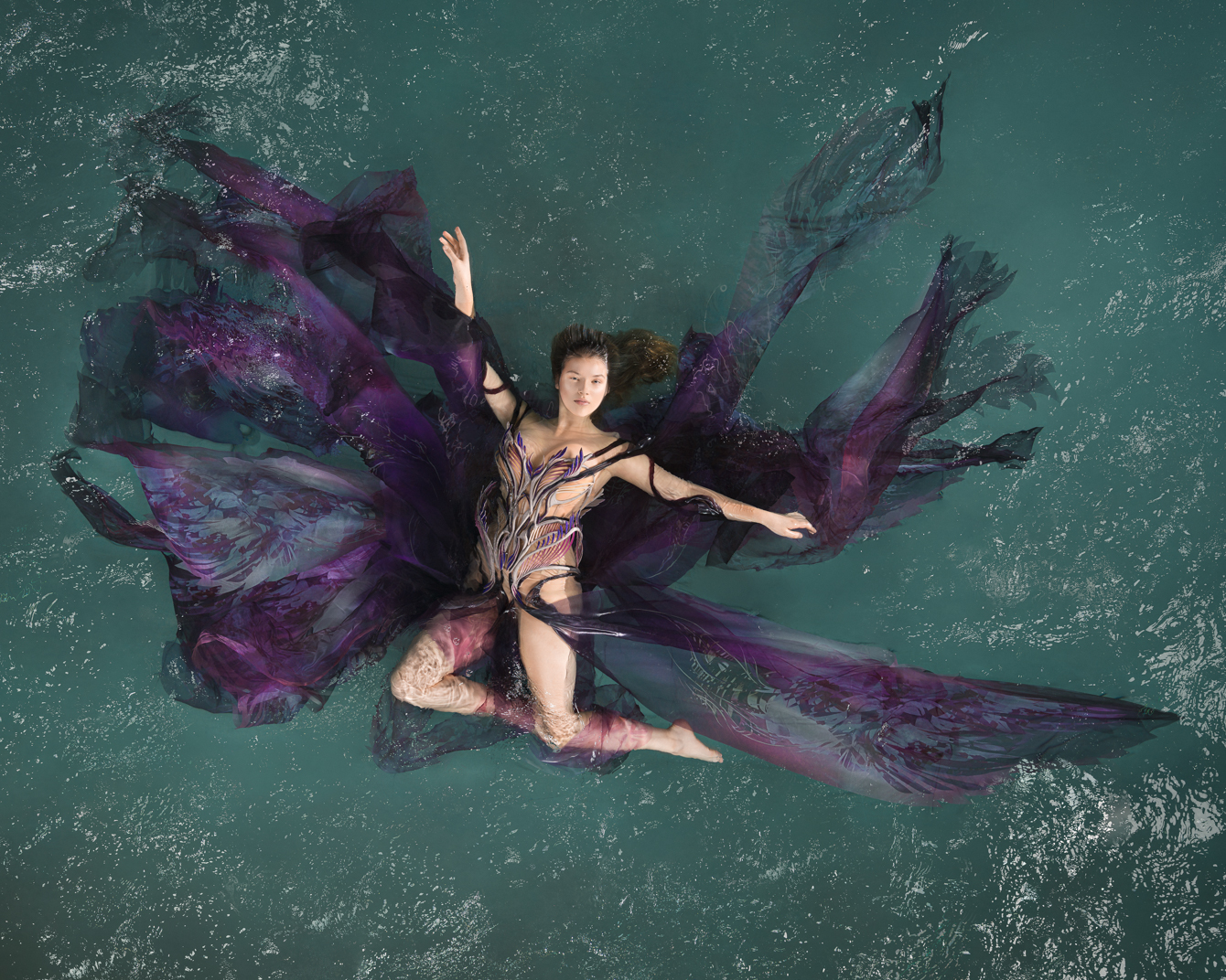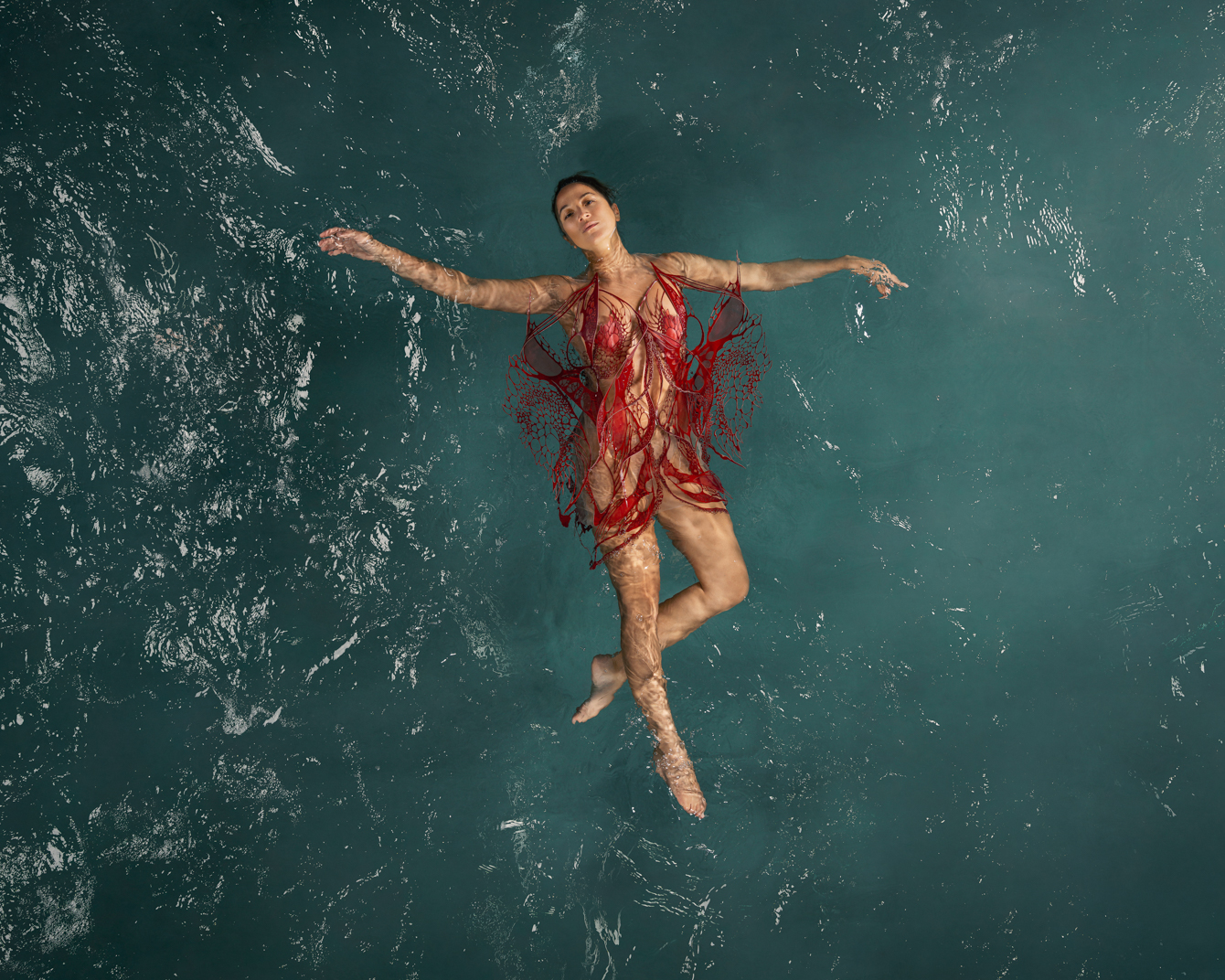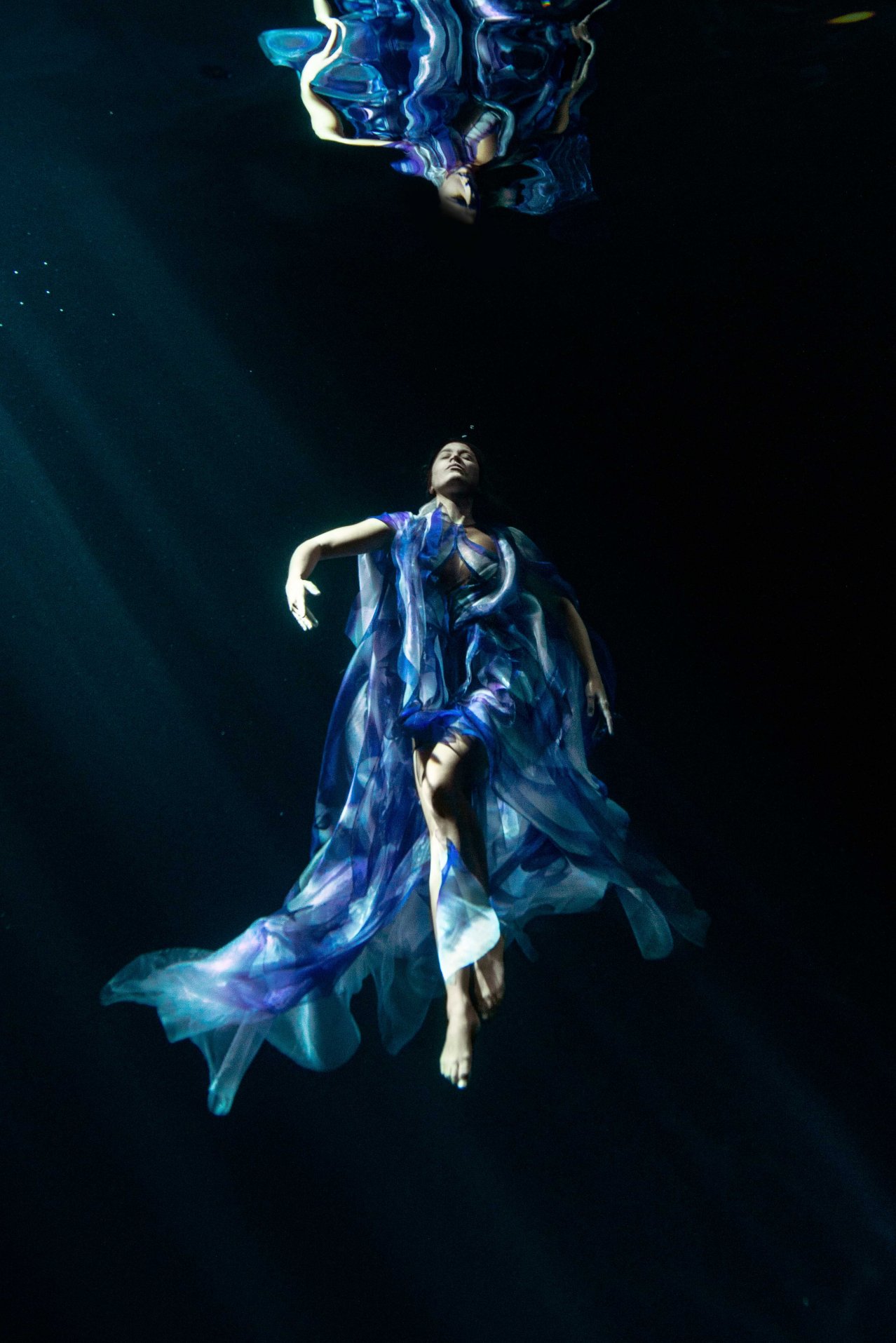 這位前衛創新的設計師和同樣多才多藝的法國舞蹈家、編舞家、水下電影製作人和自由潛水員 Julie Gautier 合作,透過舞者在水中舞動,服飾也隨之擺盪起伏,仿佛幻化成奇妙的海底生物。 Iris van herpen 2023 couture #傳遞知識的副料大學