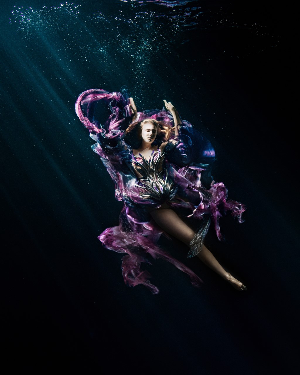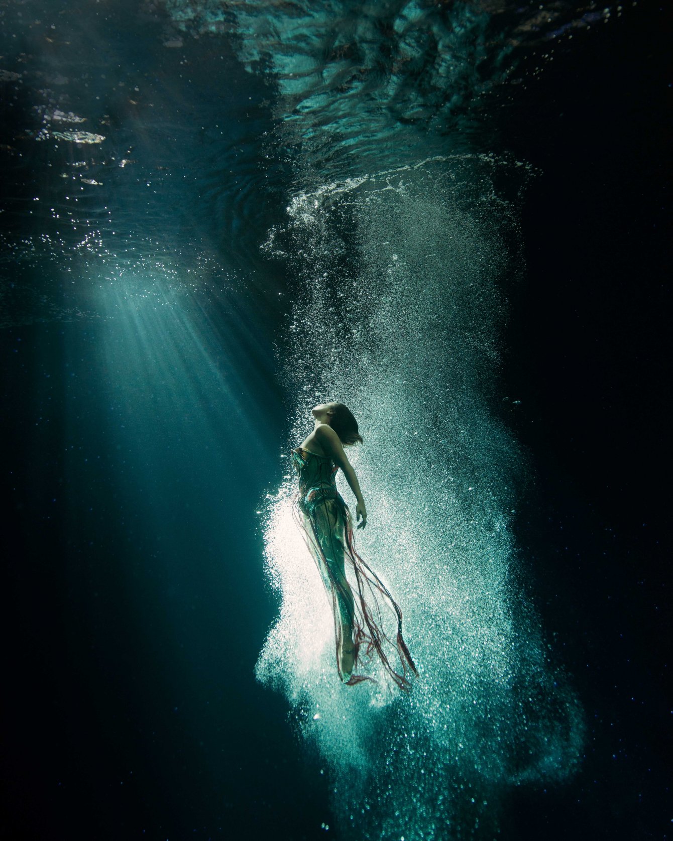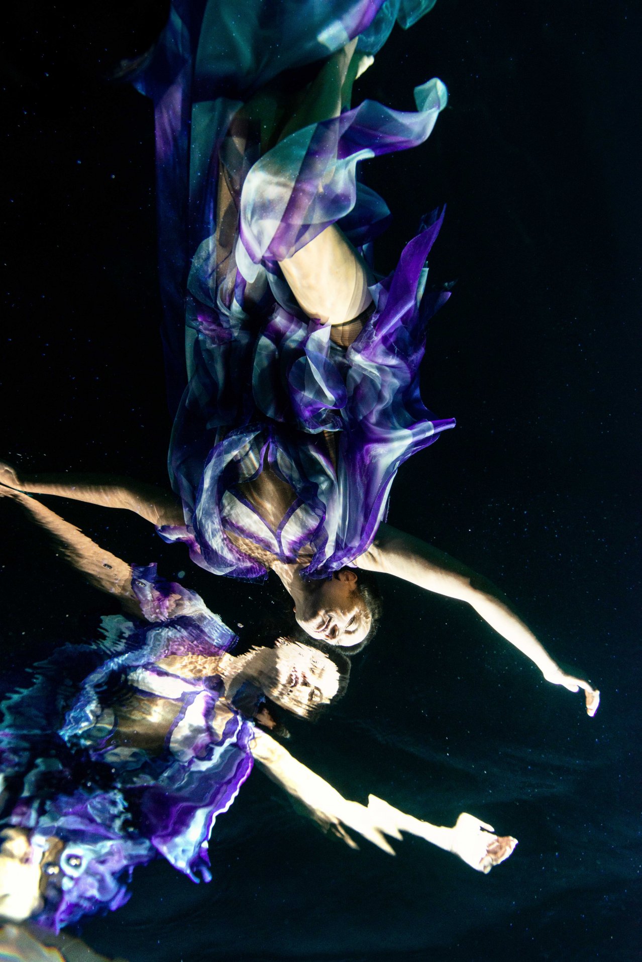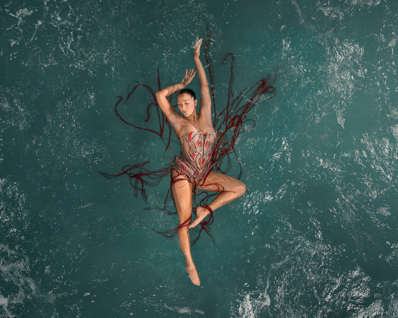 這位前衛創新的設計師和同樣多才多藝的法國舞蹈家、編舞家、水下電影製作人和自由潛水員 Julie Gautier 合作,透過舞者在水中舞動,服飾也隨之擺盪起伏,仿佛幻化成奇妙的海底生物。 Iris van herpen 2023 couture #傳遞知識的副料大學