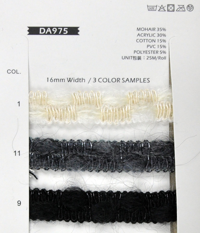 Mohair35% Acrylic30% Polyvinyl-chloride15% Cotton15% Polyester5%